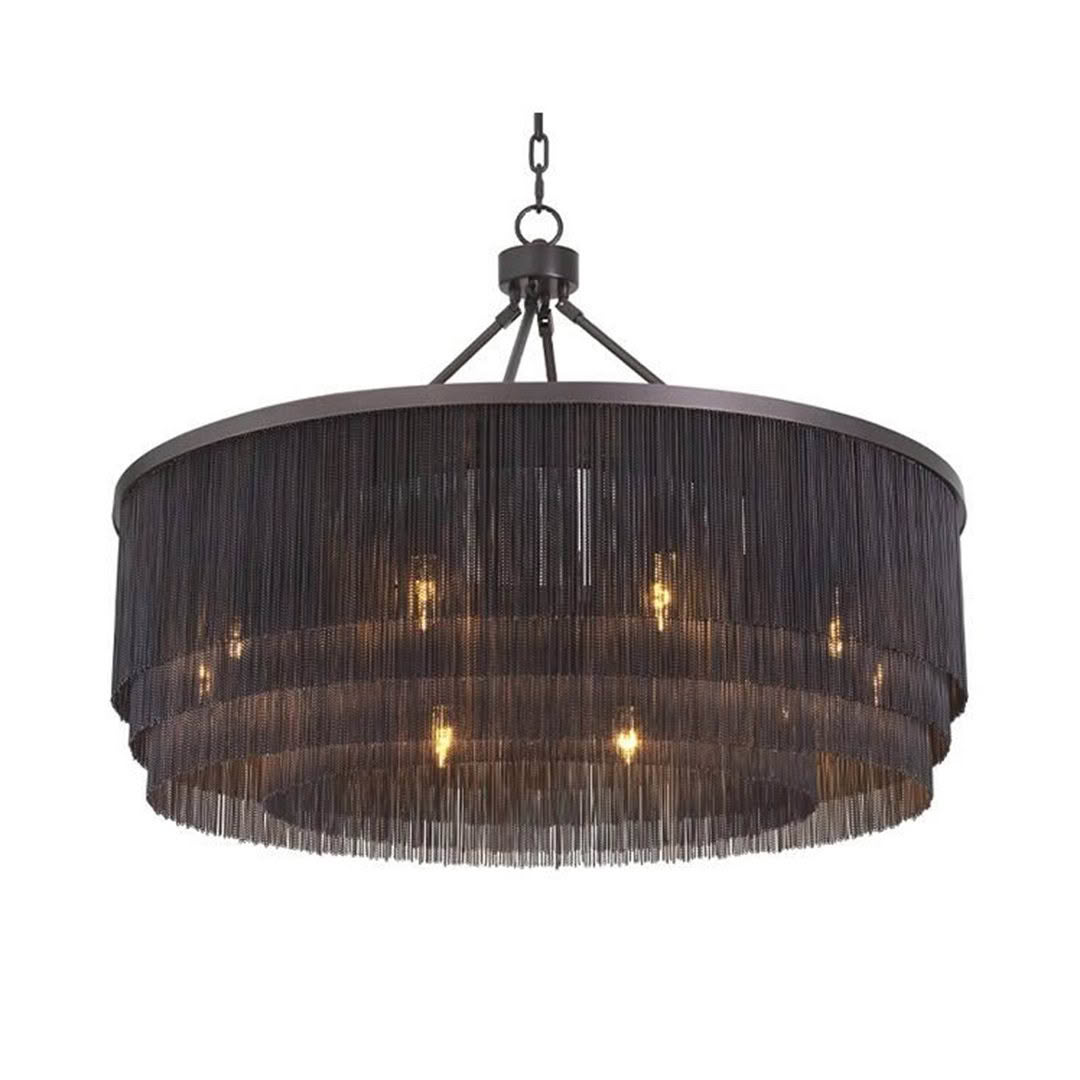 Ornate gold chandelier with black lampshades and lit bulbsOrnate gold chandelier with black shades and lit bulbs