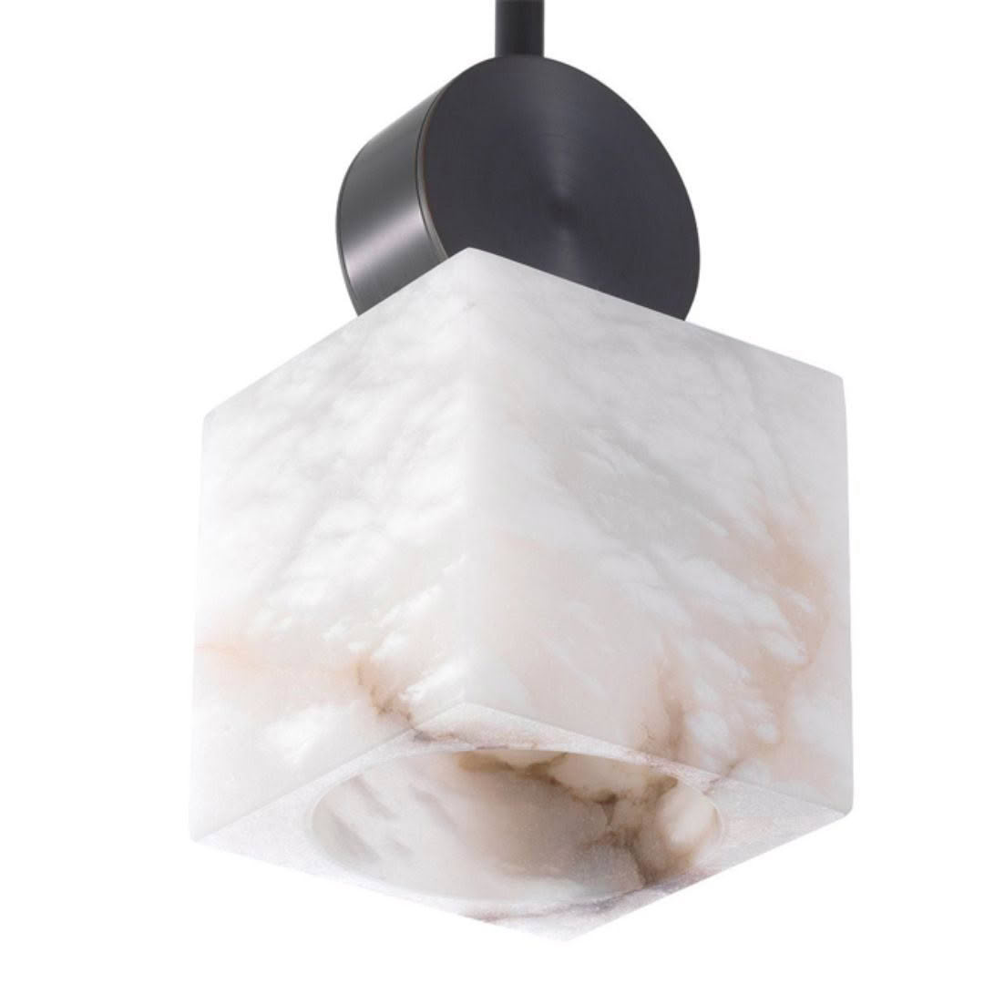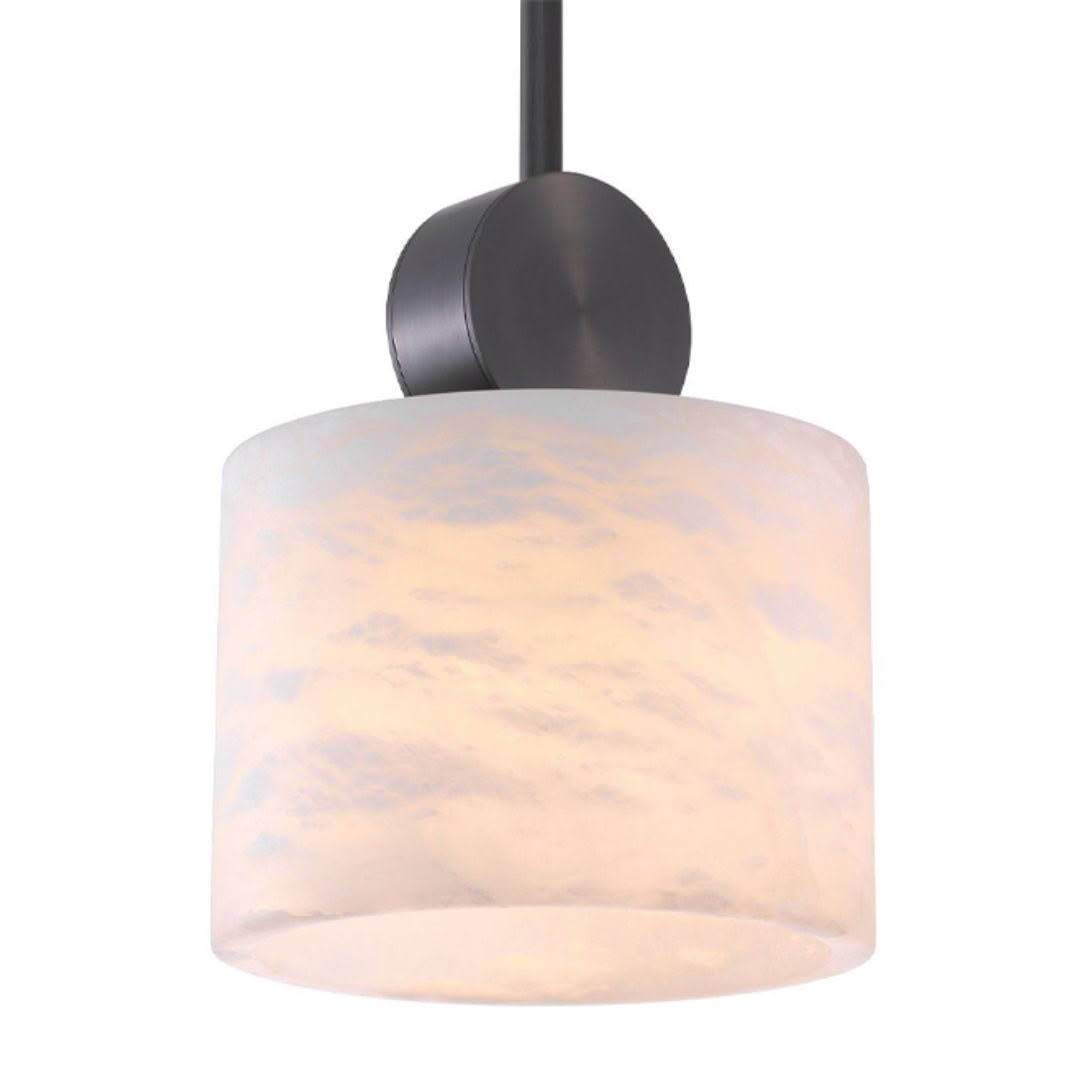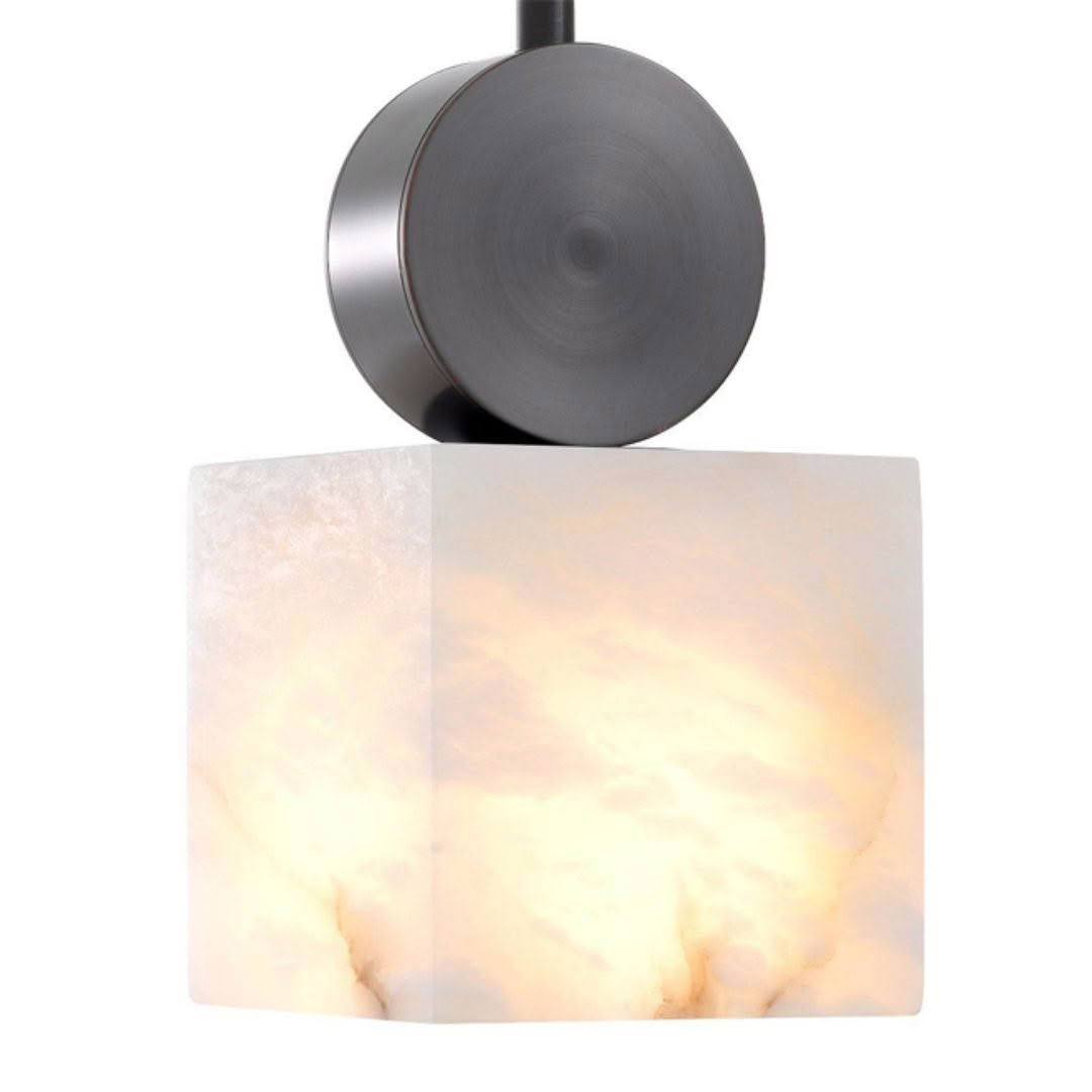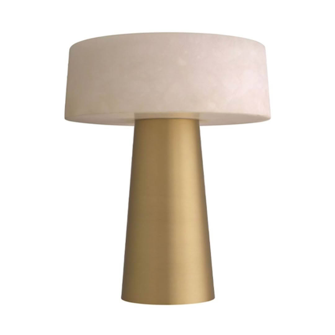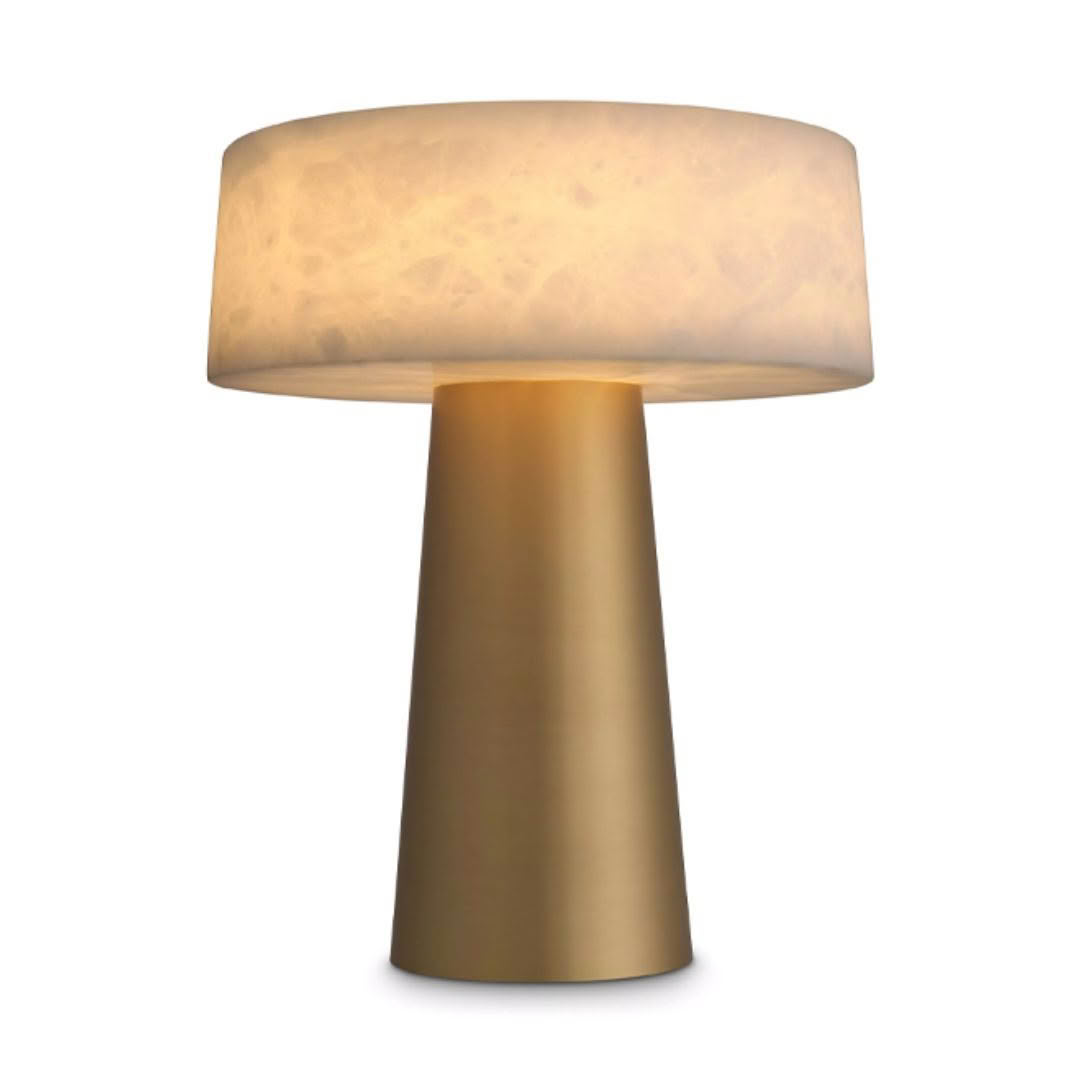 Elegant alabaster table lamp with square linen shadeElegant marble table lamp beside a beige sofa