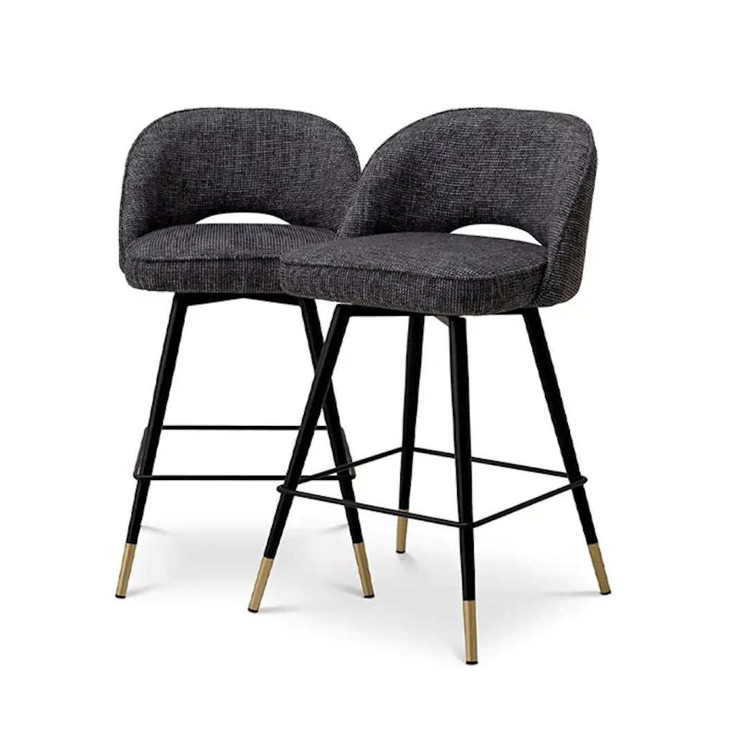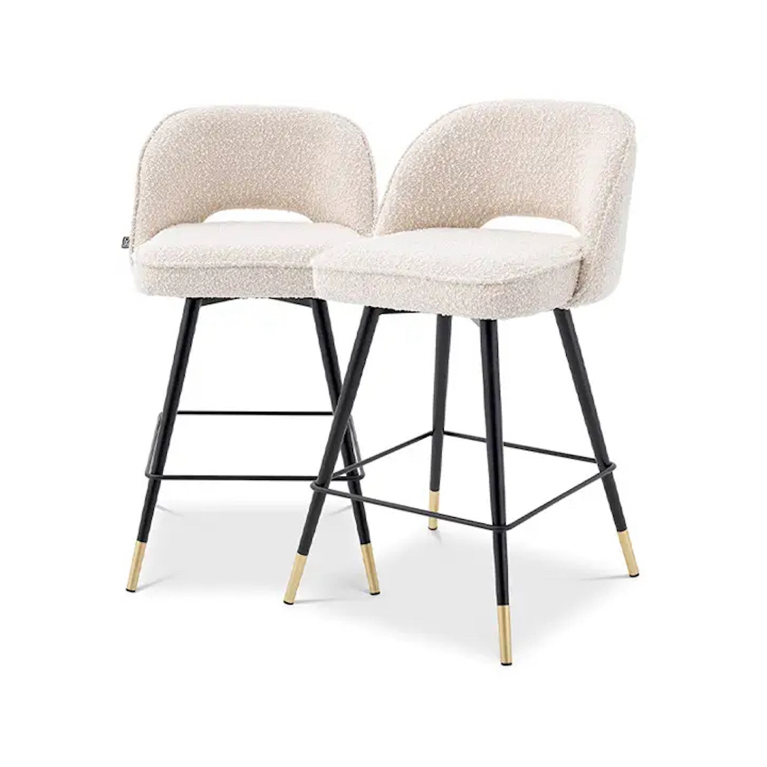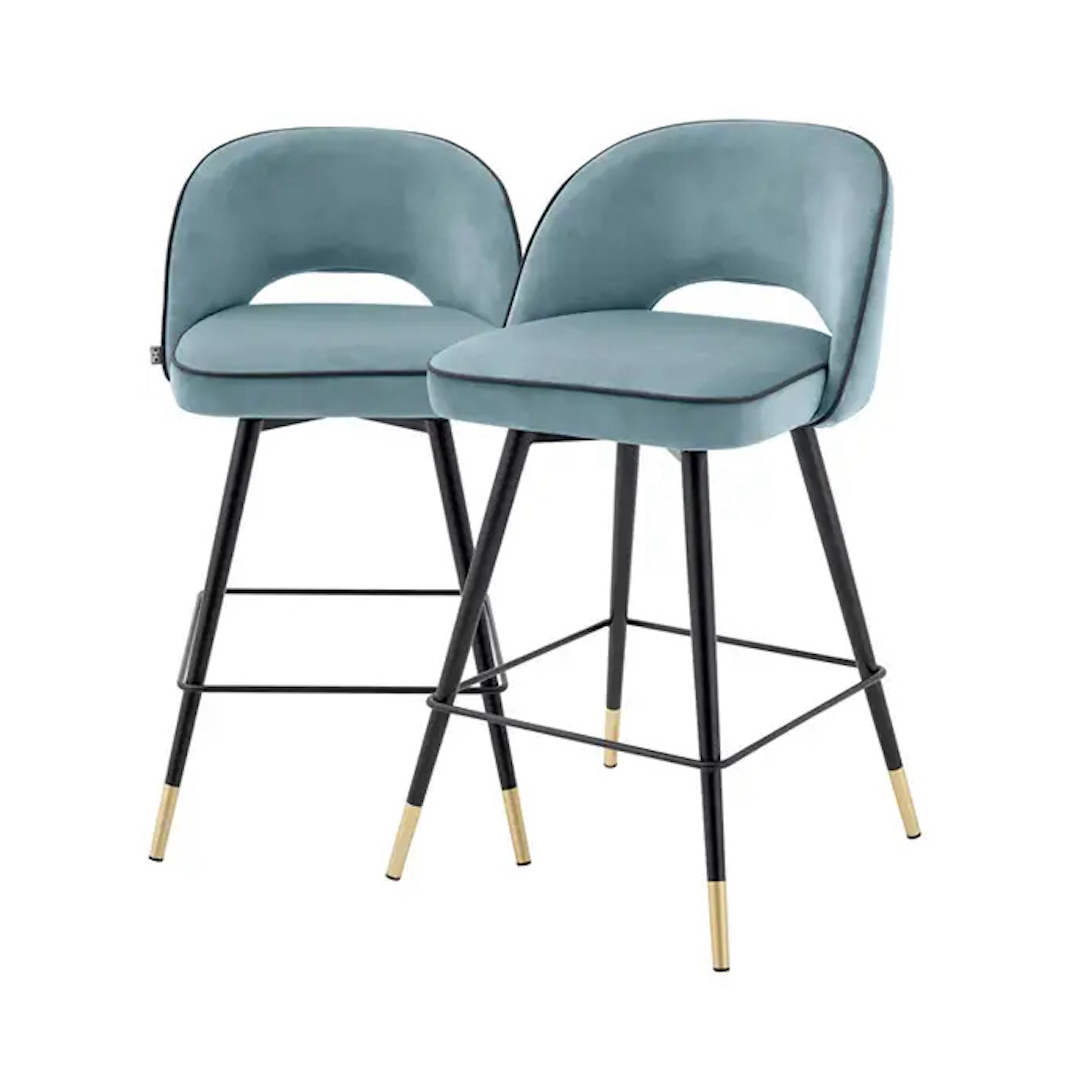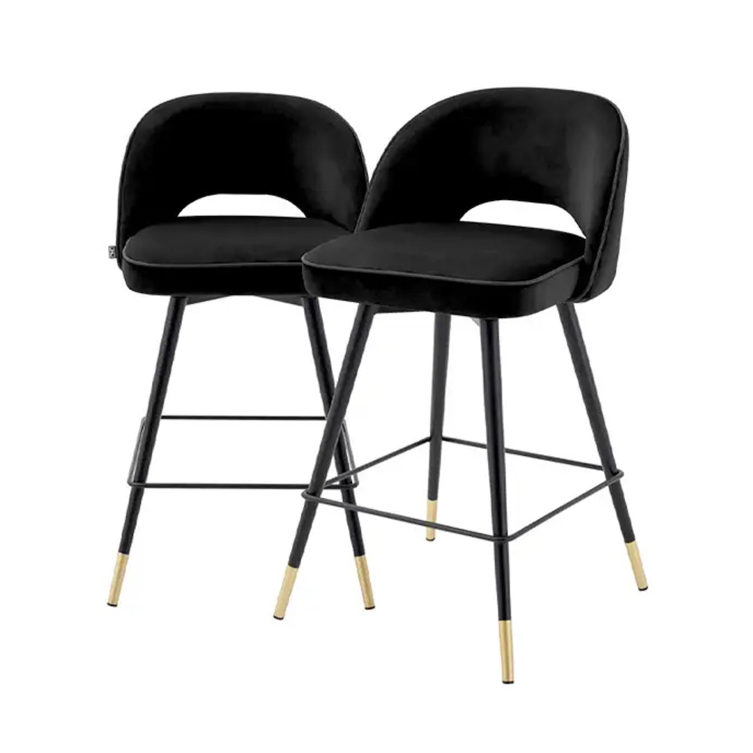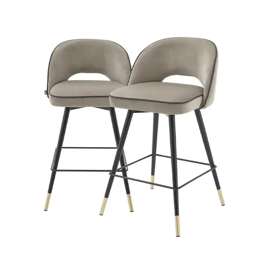 Create a wow-worthy interior with the Cliff Counter Stool in Savona greige velvet, that comes in a set of 2. Featuring black tapered legs with gold caps, the solid frame holds an armless back that is open at the bottom before the seat. Its stylish silhouette is accentuated with black faux leather piping.