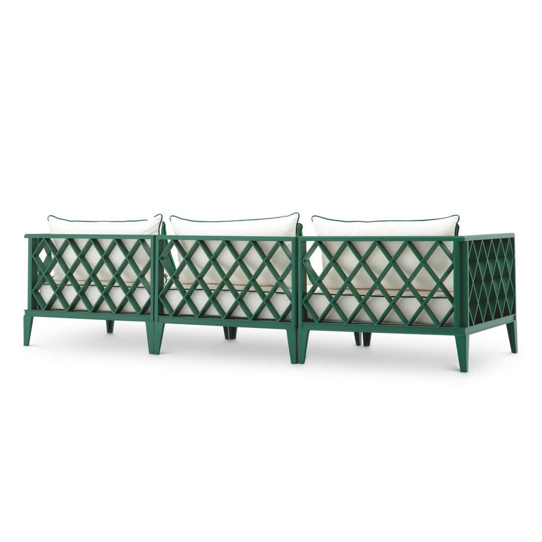 Discover the Ocean Club Outdoor Sofa for the ultimate garden experience season after season. This sumptuous sofa is a stylish addition to your conservatory or outdoor living space. It is made from heavy-duty materials for timeless design and resilience. It features a matte-finish frame in striking green and blaise off-white cushion covers, which are finished with contrast piping and offer an ultra-comfortable lifestyle seating experience for you, your family, and your guests