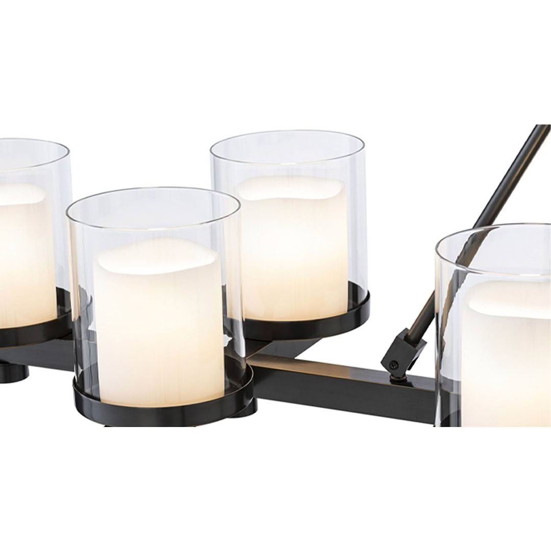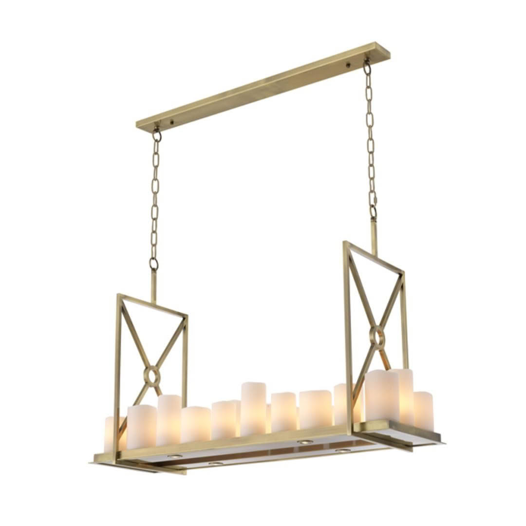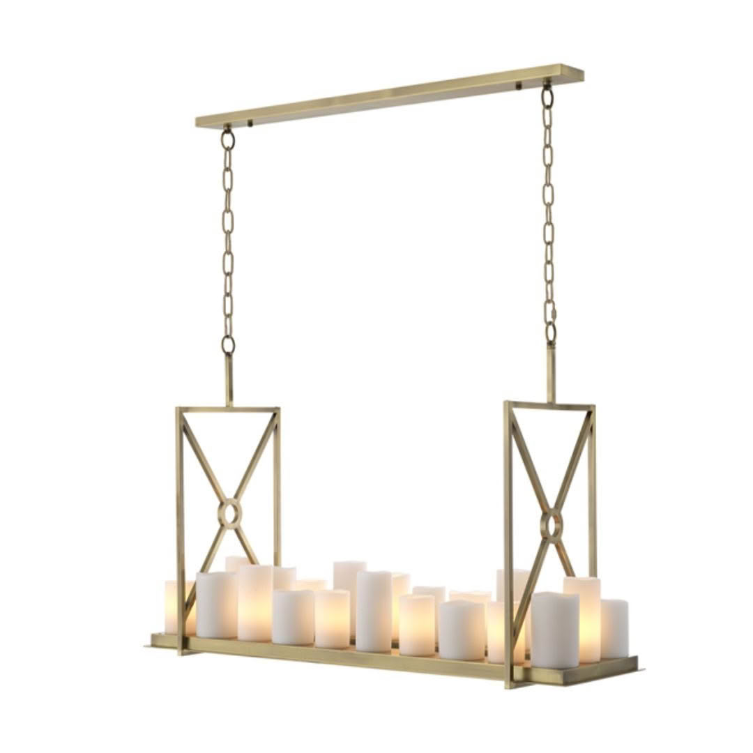 Elegant feather-designed hanging pendant lightElegant home decor with candles, books, and sculptures