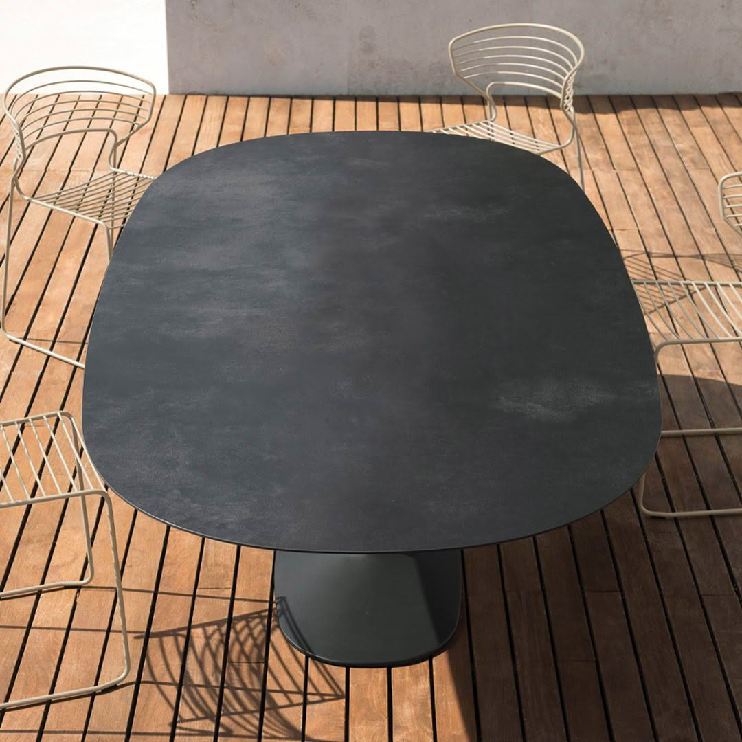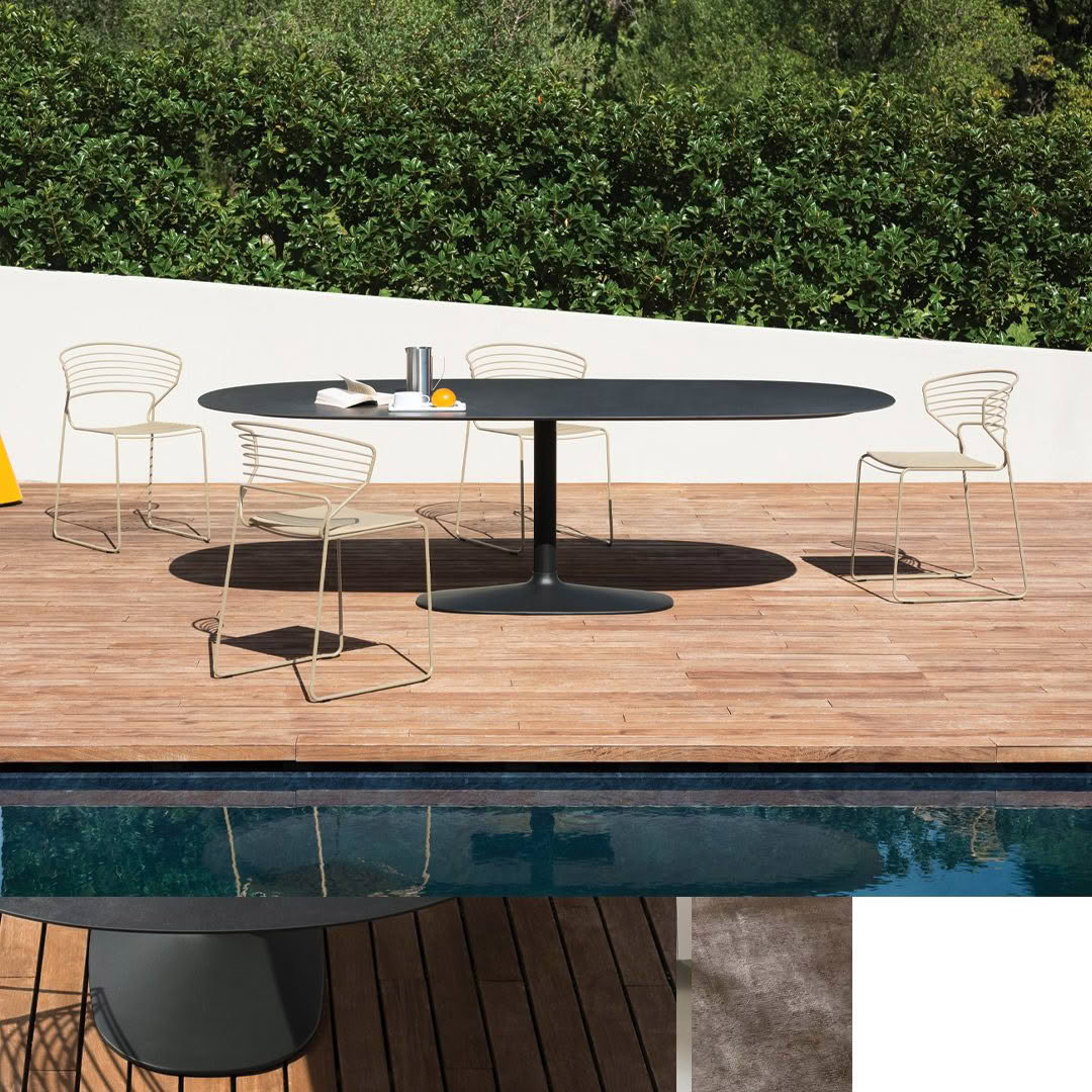 Ellis – Pocci + Dondoli, 2021. A collection of tables with an essential design and archetypal shapes, with a dual purpose for indoor and outdoor use in both domestic and collective spaces. An almost monolithic, clear presence, a silhouette that stands out in the space connoting it with character and style.