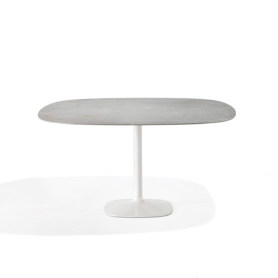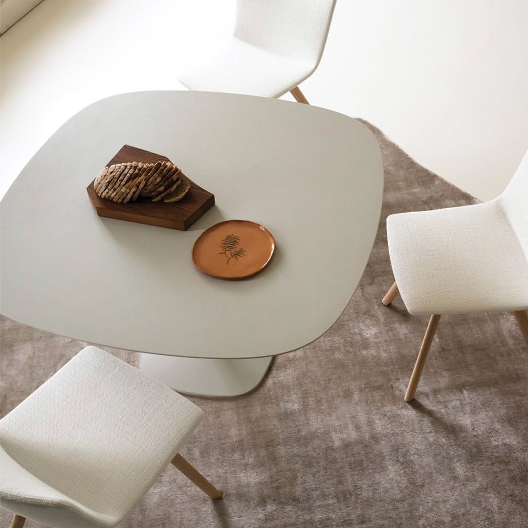 The strong overhang of the tops emphasizes the distance between their surface and the light bases, thus giving elegance and lightness to this collection of tables of different sizes, created to meet different living needs.
