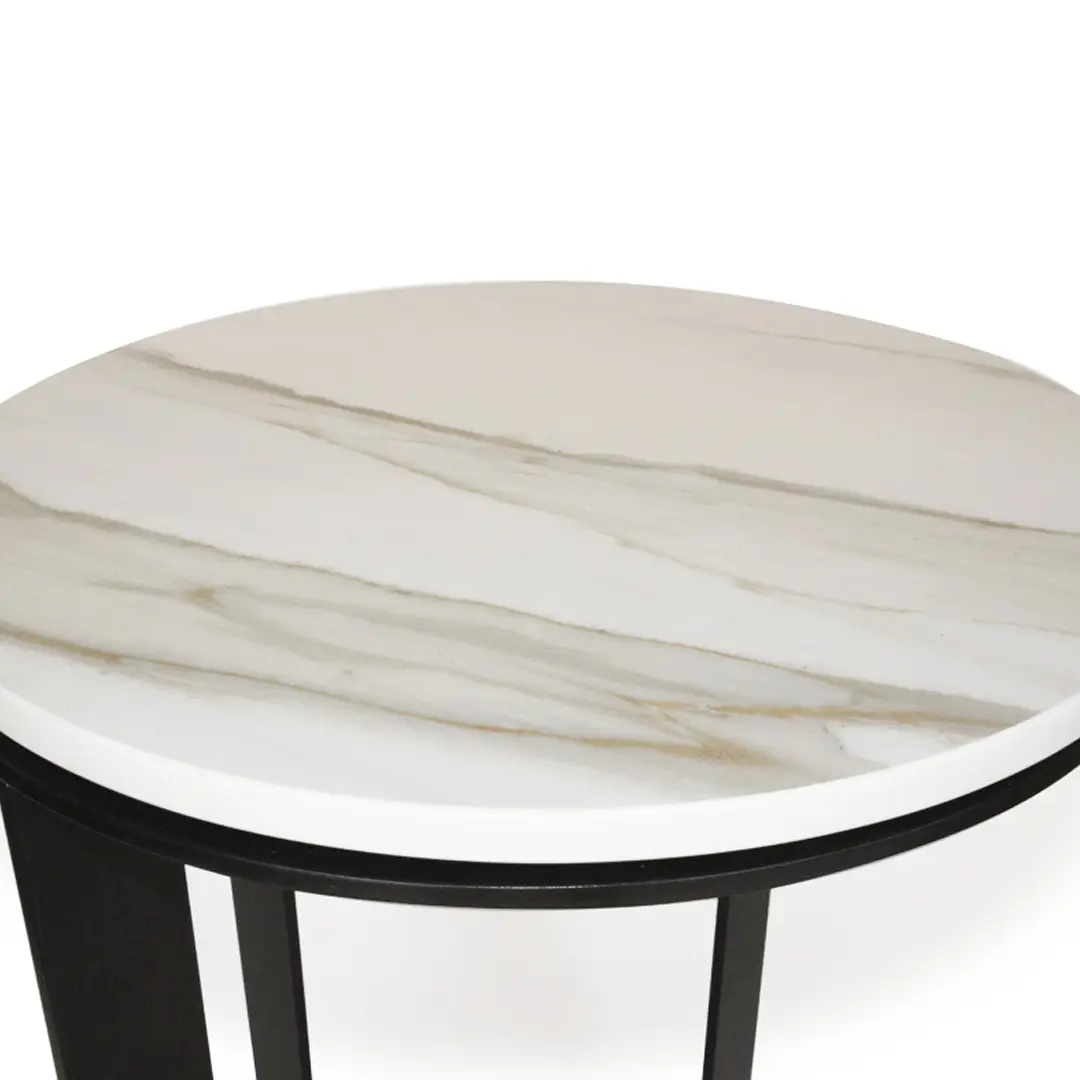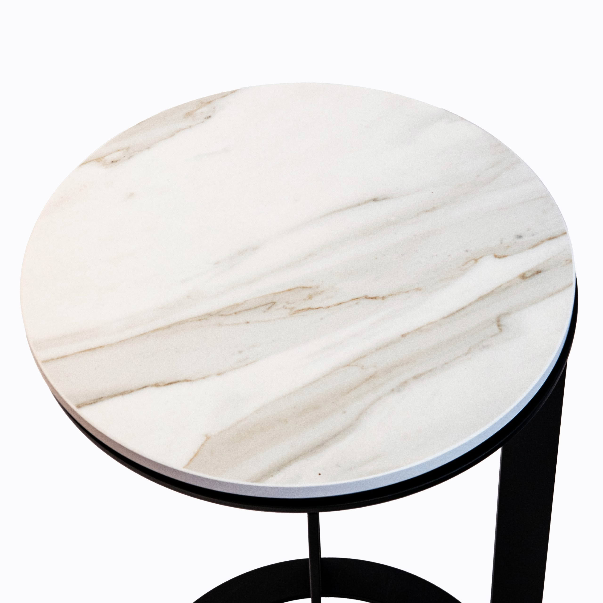 ENZO DRINKS TABLE available in blue gun steel and matt black steel with Neolith porcelain top.