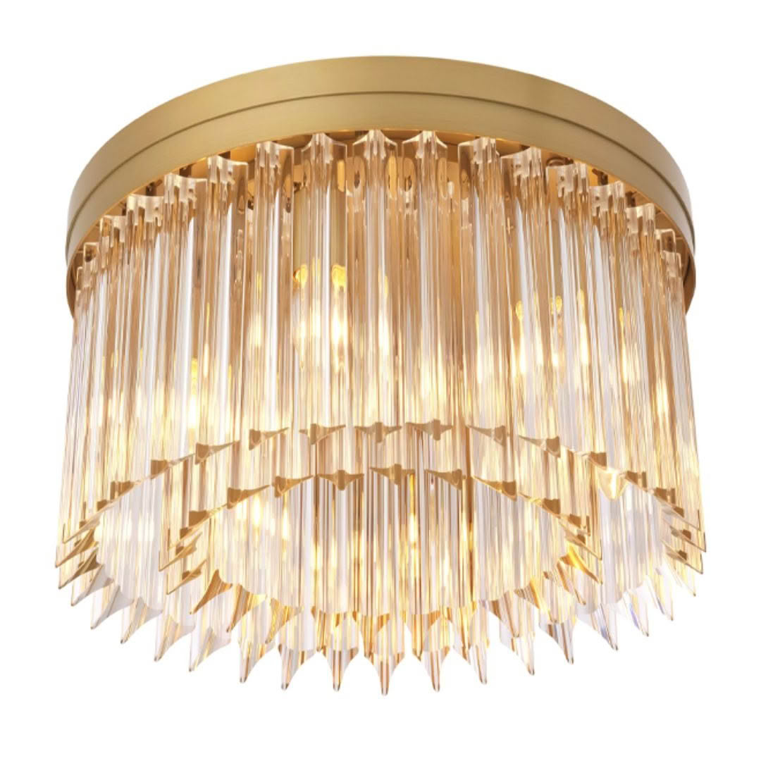 Top off your décor with Ceiling Lamp Evina. This Art Deco style flush mount ceiling lamp with antique brass finish is adorned with 2 rows of clear glass rods that capture the light creating a sparkling beauty that is perfect for lighting in hallways, living spaces or bedrooms.