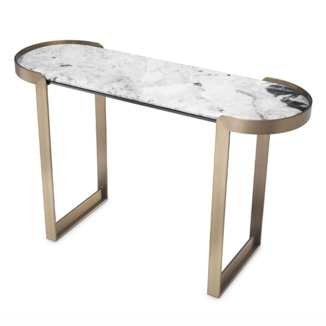 Taking inspiration from Art Deco design, the Fabio Console Table is a stylish addition to any hallway and a perfect base for showcasing flower arrangements, picture frames and other decorative objects. Finished in brushed brass, the metal legs elegantly curve around the ends of the pill-shaped tabletop from Barcelona marble.