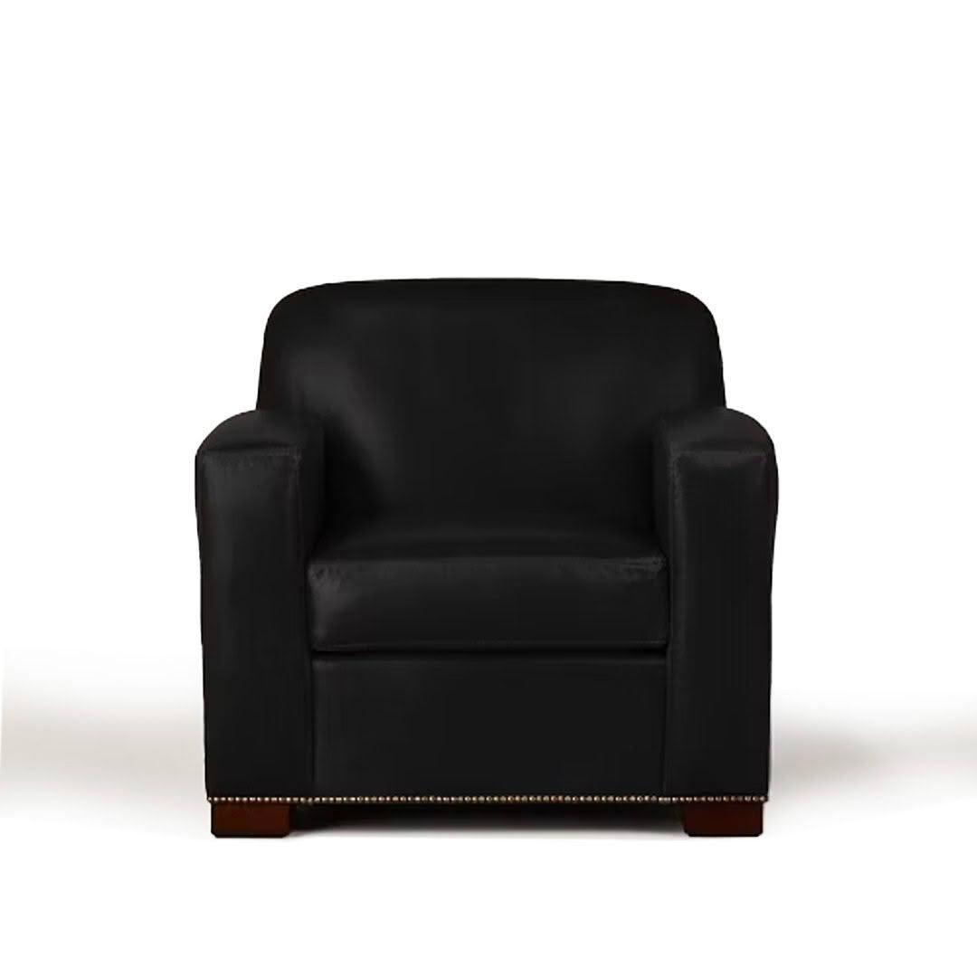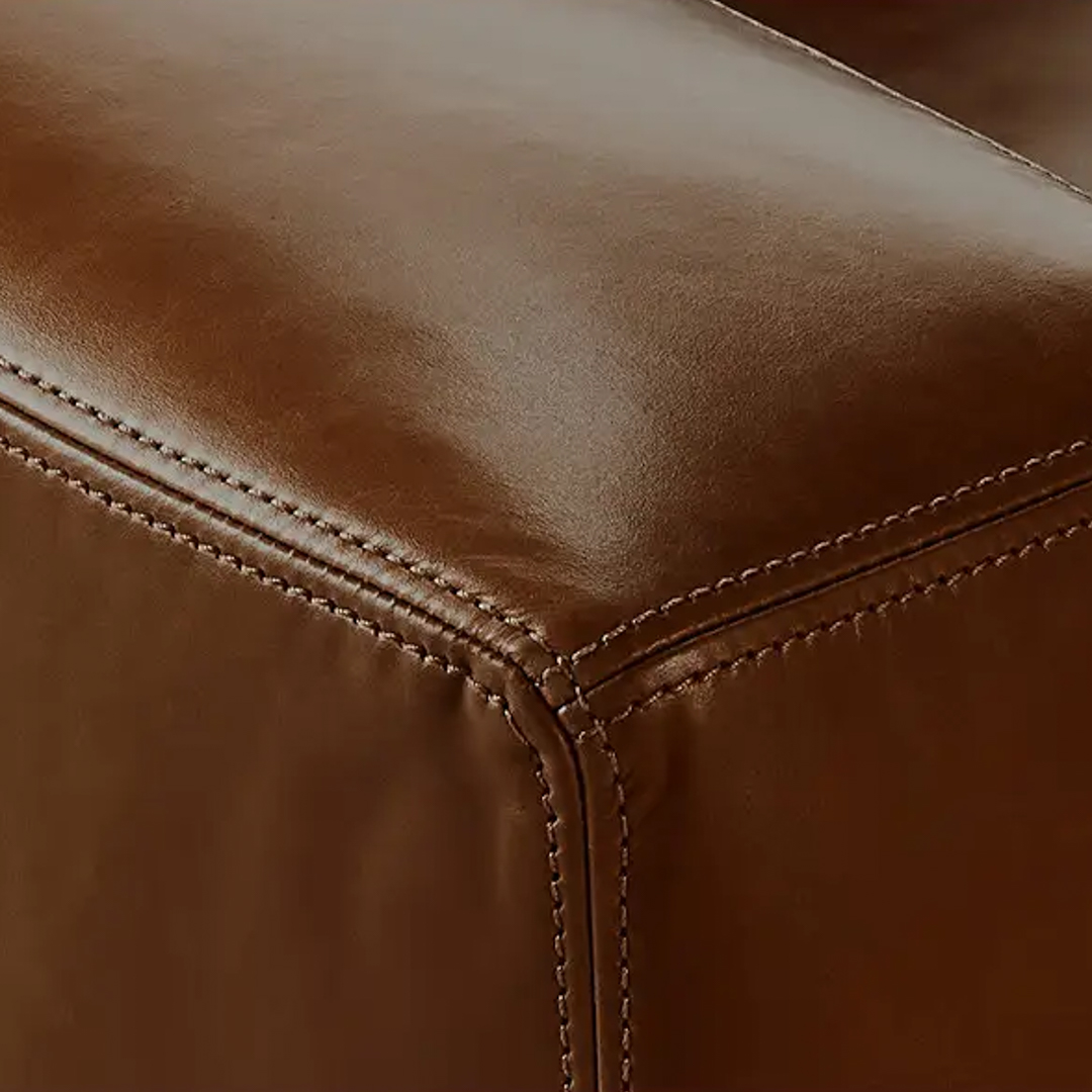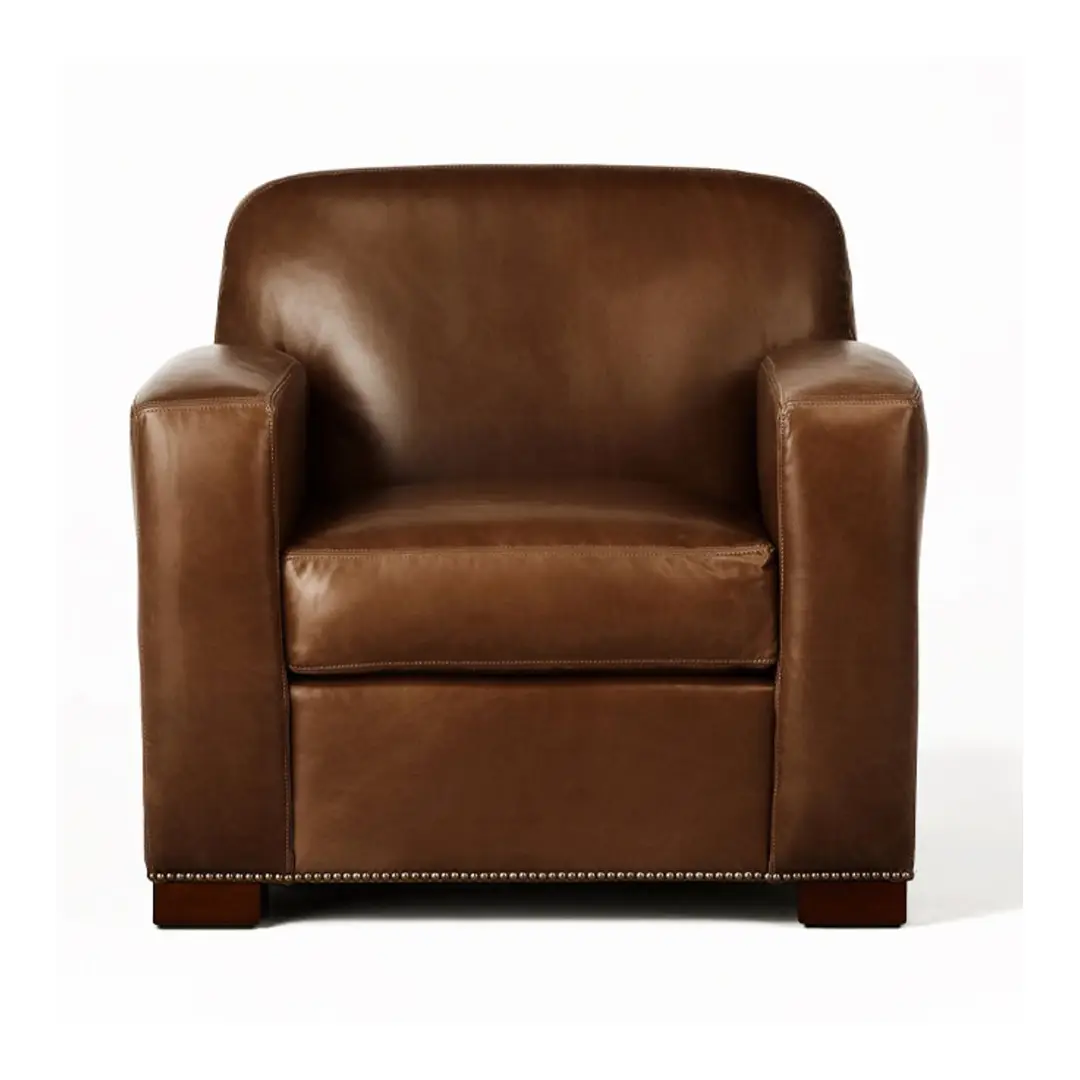 Styled after classic 1940s club chairs, the Grant is presented with cushioned curves enveloped in soft leather upholstery. Set upon solid wood block feet, this loungeworthy piece is detailed with saddle-stitched seams and brass nailhead trim.