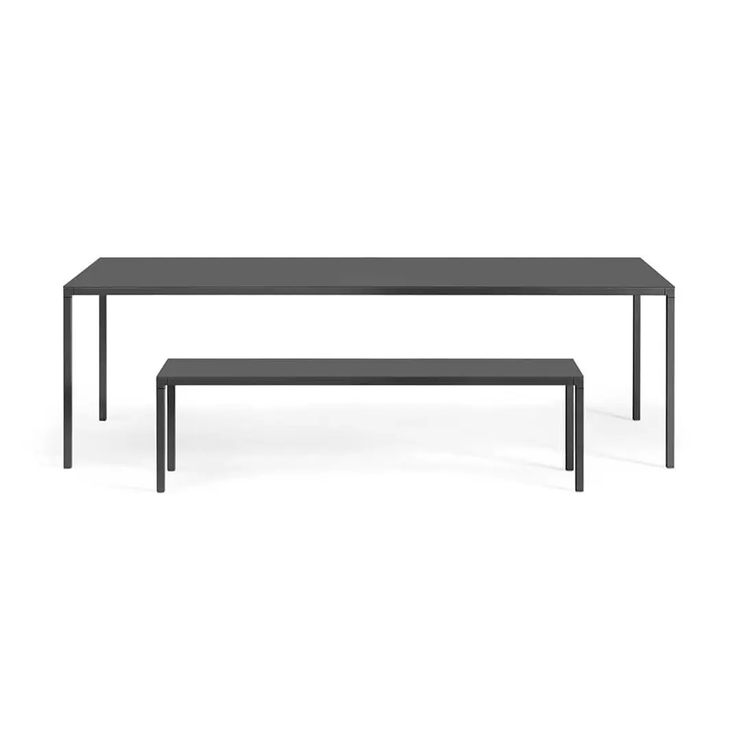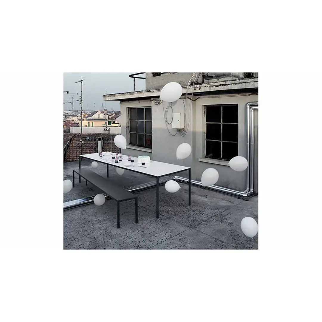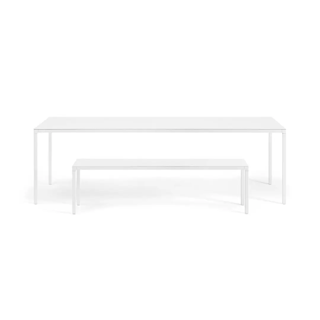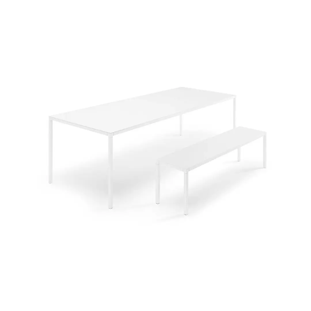 Range of outdoor tables with to-be-assembled steel frame (section mm 30×30 / 35×35), and die-cast aluminium joints. Finishes: matt white, graphite, rope beige. Tops in white / rope beige metal sheet (only on 30), white layered laminate, white layered pierced laminate, ceramic and ceramic tiles (only on 35). Outdoor benches with to-be-assembled steel frame (section mm 30×30), and die-cast aluminium joints. Finishes: matt white, graphite, rope beige. Tops in white / rope beige metal sheet, white layered laminate, ceramic.