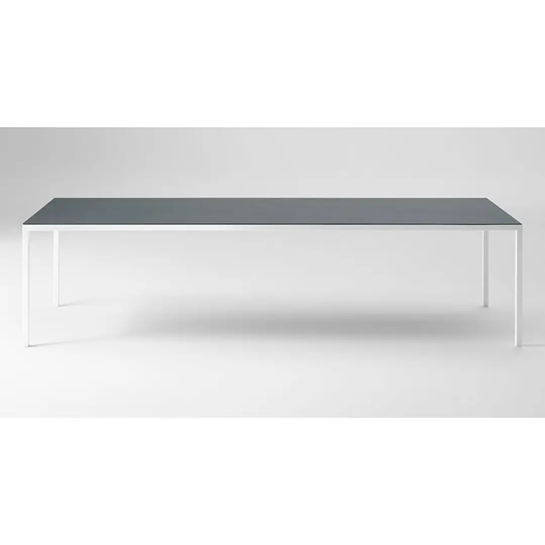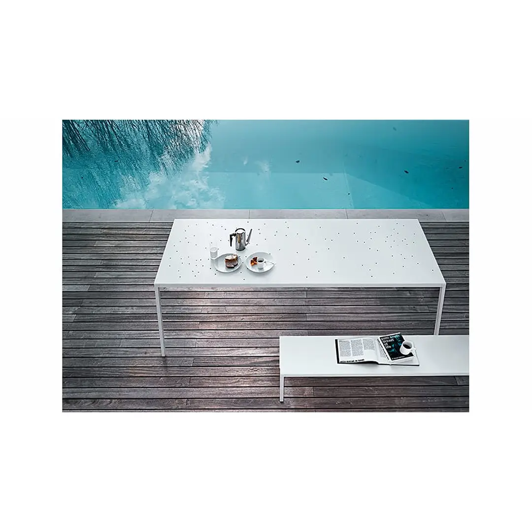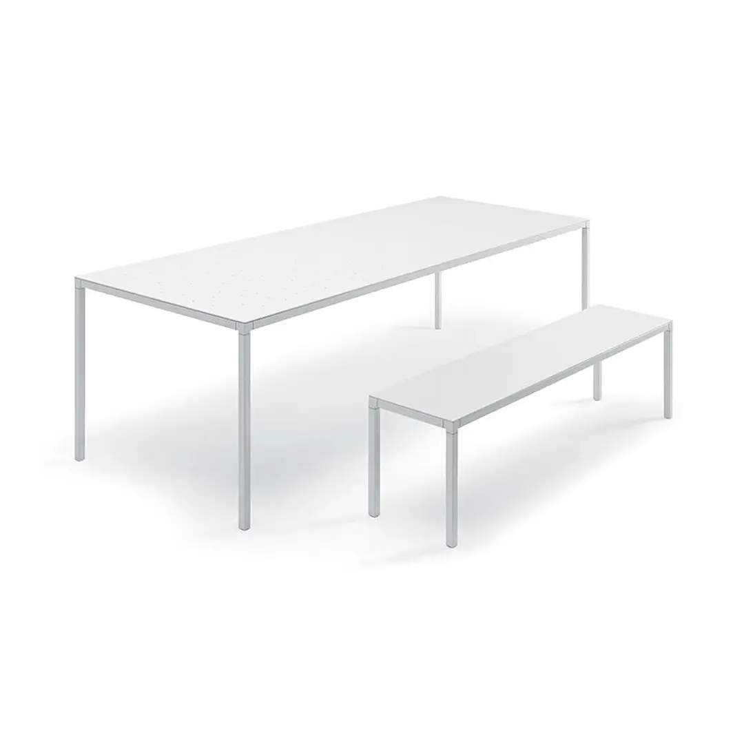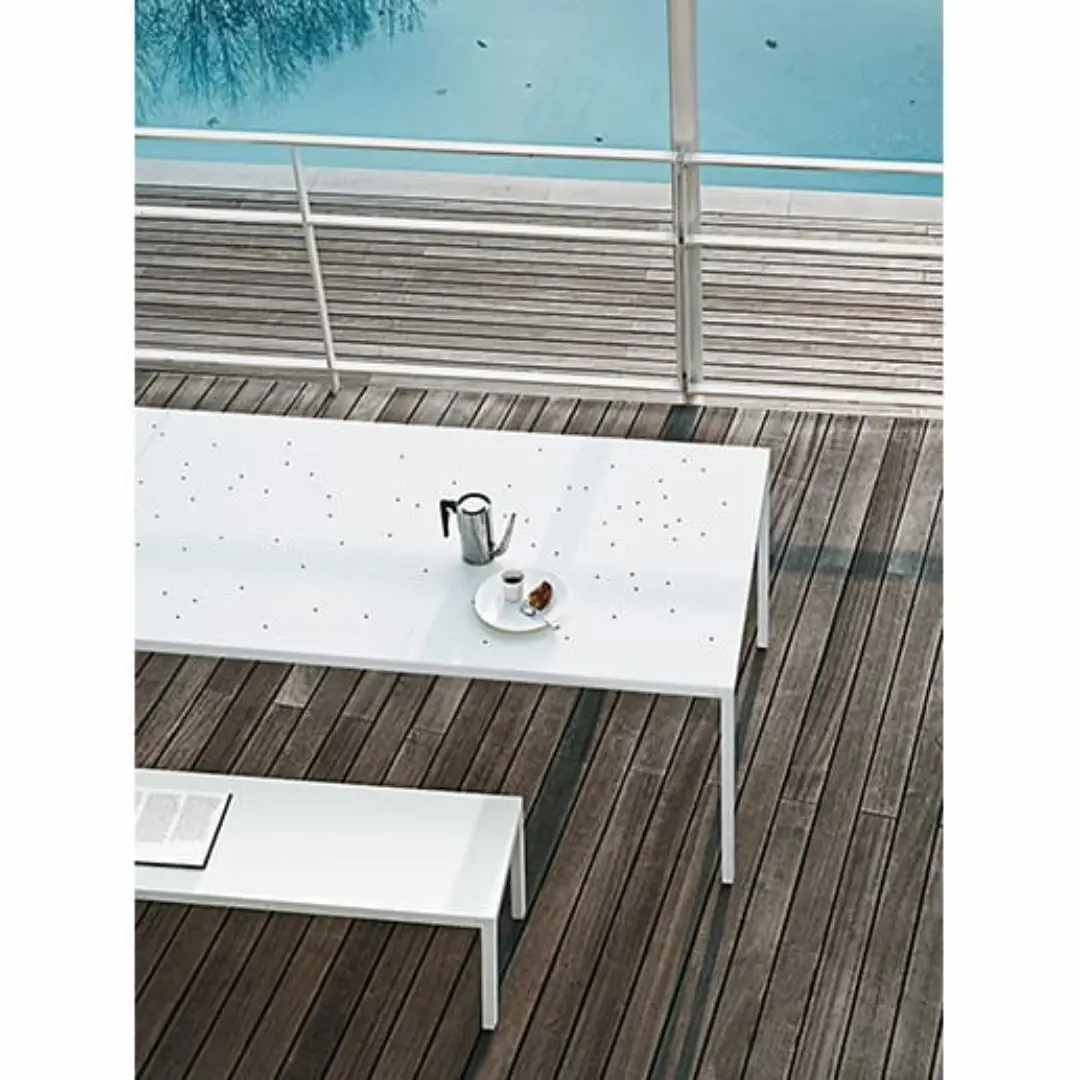 Range of outdoor tables with to-be-assembled steel frame (section mm 30×30 / 35×35), and die-cast aluminium joints. Finishes: matt white, graphite, rope beige. Tops in white / rope beige metal sheet (only on 30), white layered laminate, white layered pierced laminate, ceramic and ceramic tiles (only on 35). Outdoor benches with to-be-assembled steel frame (section mm 30×30), and die-cast aluminium joints. Finishes: matt white, graphite, rope beige. Tops in white / rope beige metal sheet, white layered laminate, ceramic.