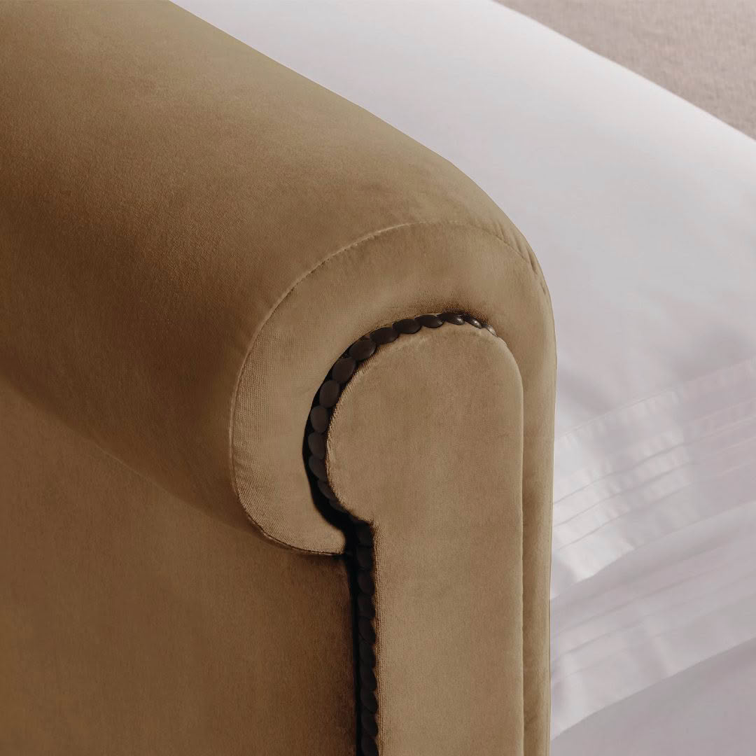 Inspired by elegant island living, the Jamaica bed features a scrolled headboard and footboard with supple padding and hand-upholstery. Notable details include low reeded block feet and gleaming nailhead trim.