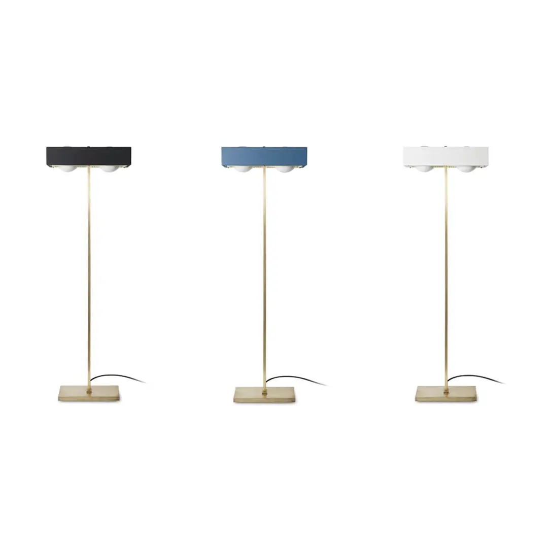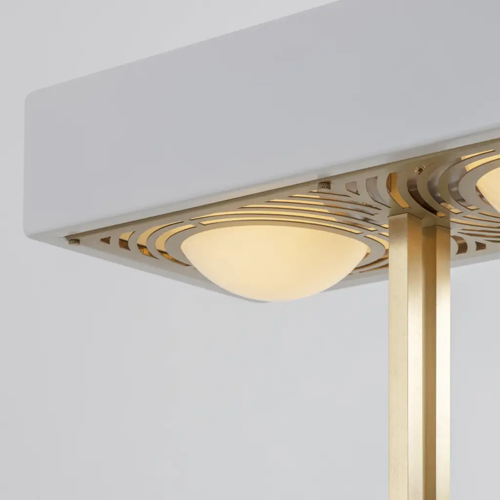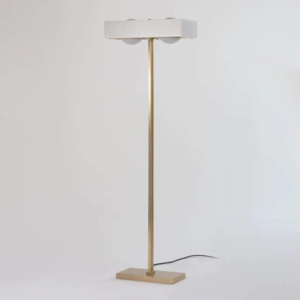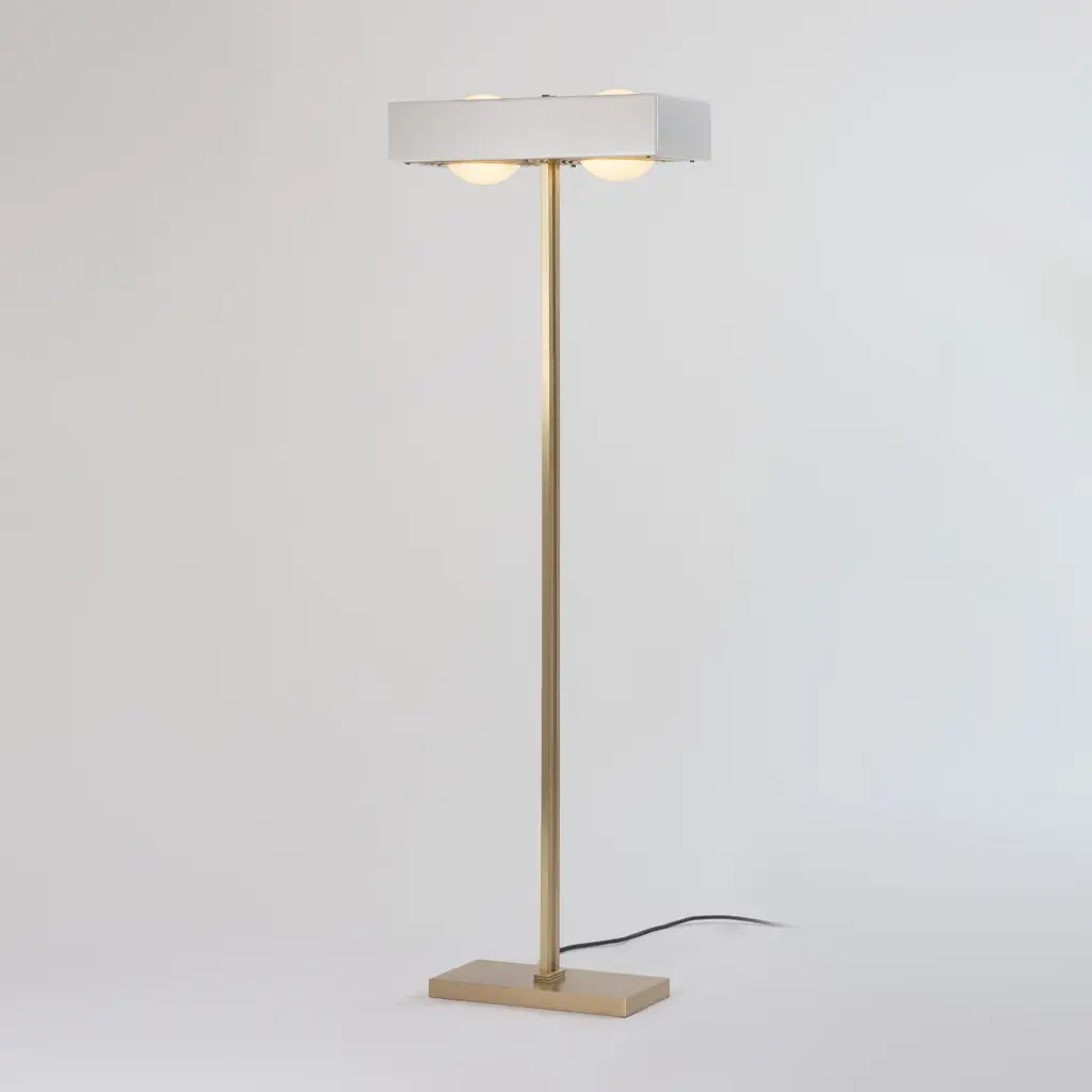 With a weighty solid brass base, the Kernel Floor Lamp boasts sharp angular lines offset by opal glass globes which cast a soft, warm light both above and below the box shade.