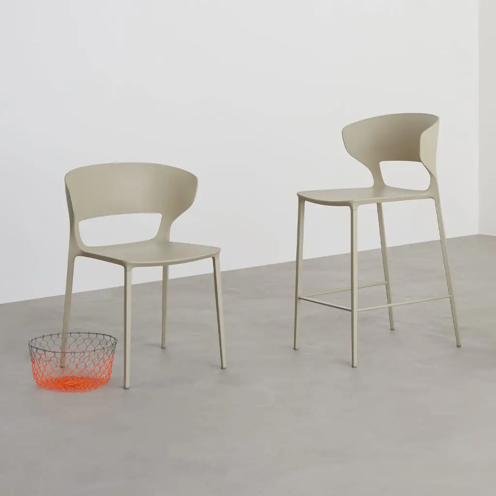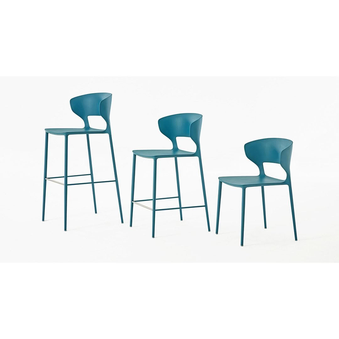 Chair inspired by the world of contract, it can find also an ideal location within private and outdoor spaces giving a touch of freshness. In the Koki chair, technology and design merge perfectly. Lines and harmonious details create a shape which appeals whichever way you look at it. Stacking chair and barstools with seat made of integral fire-resistant polyurethane, in-mould coated and inside frame in steel. Steel legs in conic shape tubular, square section, in the following finishes: chrome, lithium, matt ossidiana or lacquered in the same colours as the body. The version with lacquered legs is also suitable for outdoor.