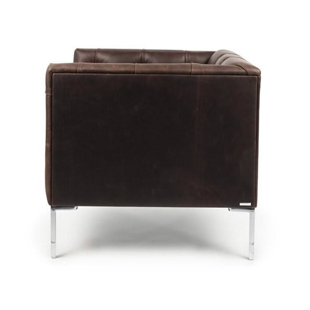 The LOUIS Armchair is a unique chair that features a deep-buttoned back, seat and inside of arms and comes with polished nickel legs.  It is tailor made in New Zealand in your choice of fabric or leather.