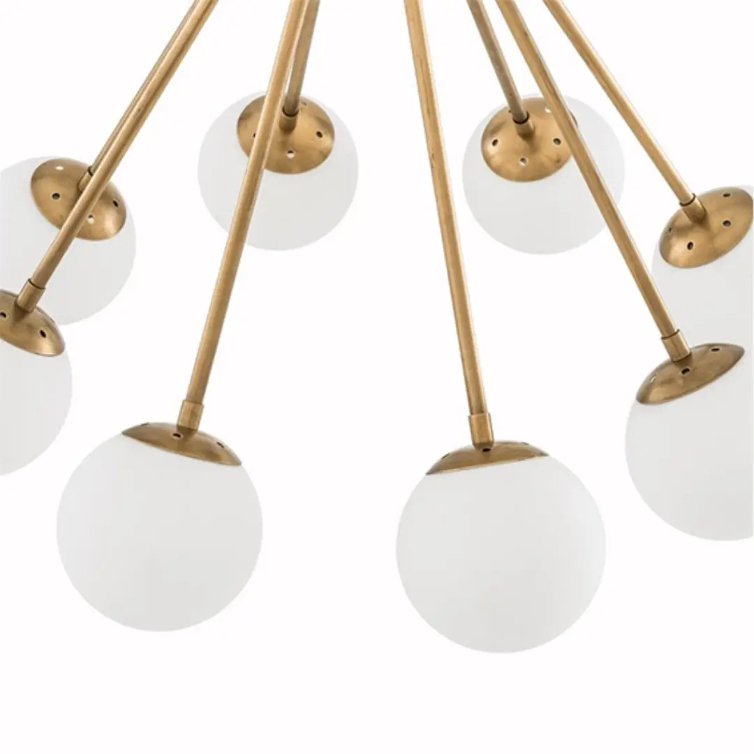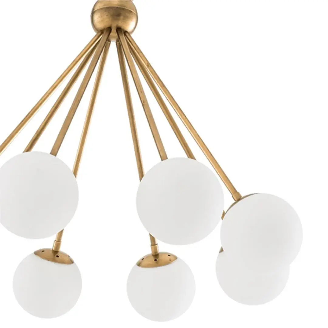 The funky Luxor Chandelier brings a splash of Mid-Century Modern flair as it illuminates your furniture arrangement. This metal fixture with antique brass finish features 8 arms spanning out from a spherical center. White glass globe shades enhance this design’s retro look.
