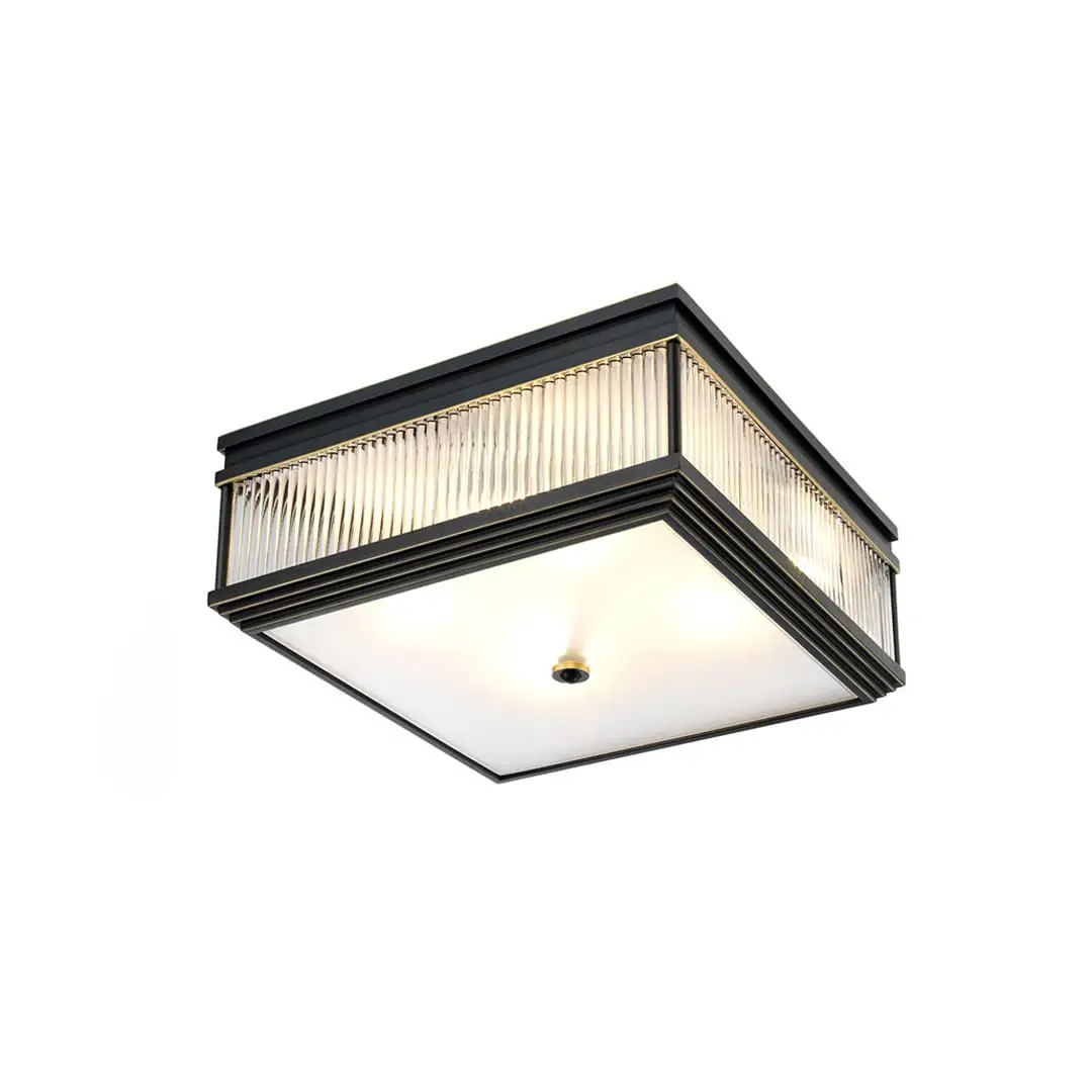 Light up your ceiling with the glamorous Marly Ceiling Lamp. Rods of clear glass are set in side panels of the square frame to create a sparkling effect. The frosted glass diffuser at the bottom hides all bulbs from view and eliminates any glare. This flush mounted ceiling light has an antique brass finish and is ideal for lower height ceilings.