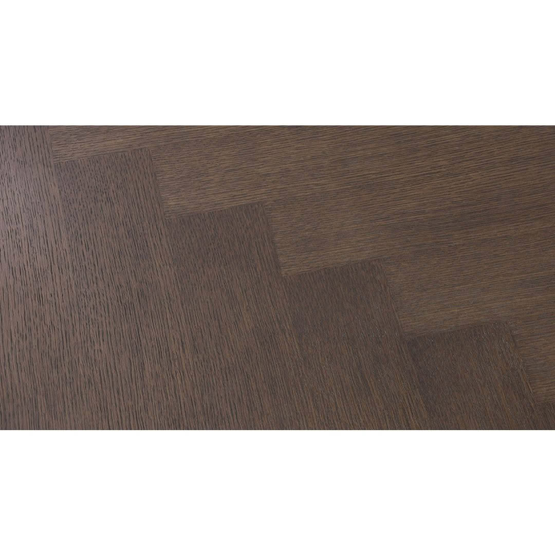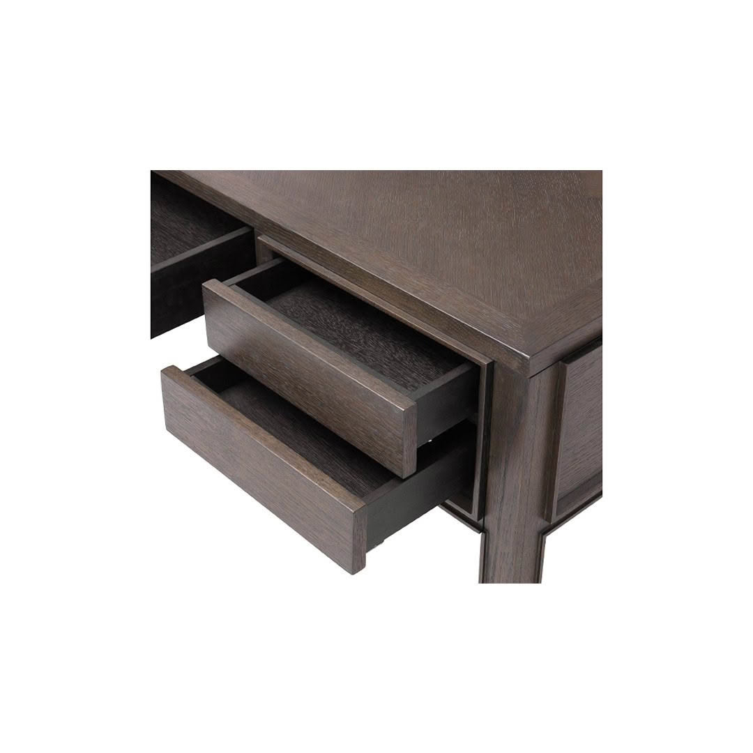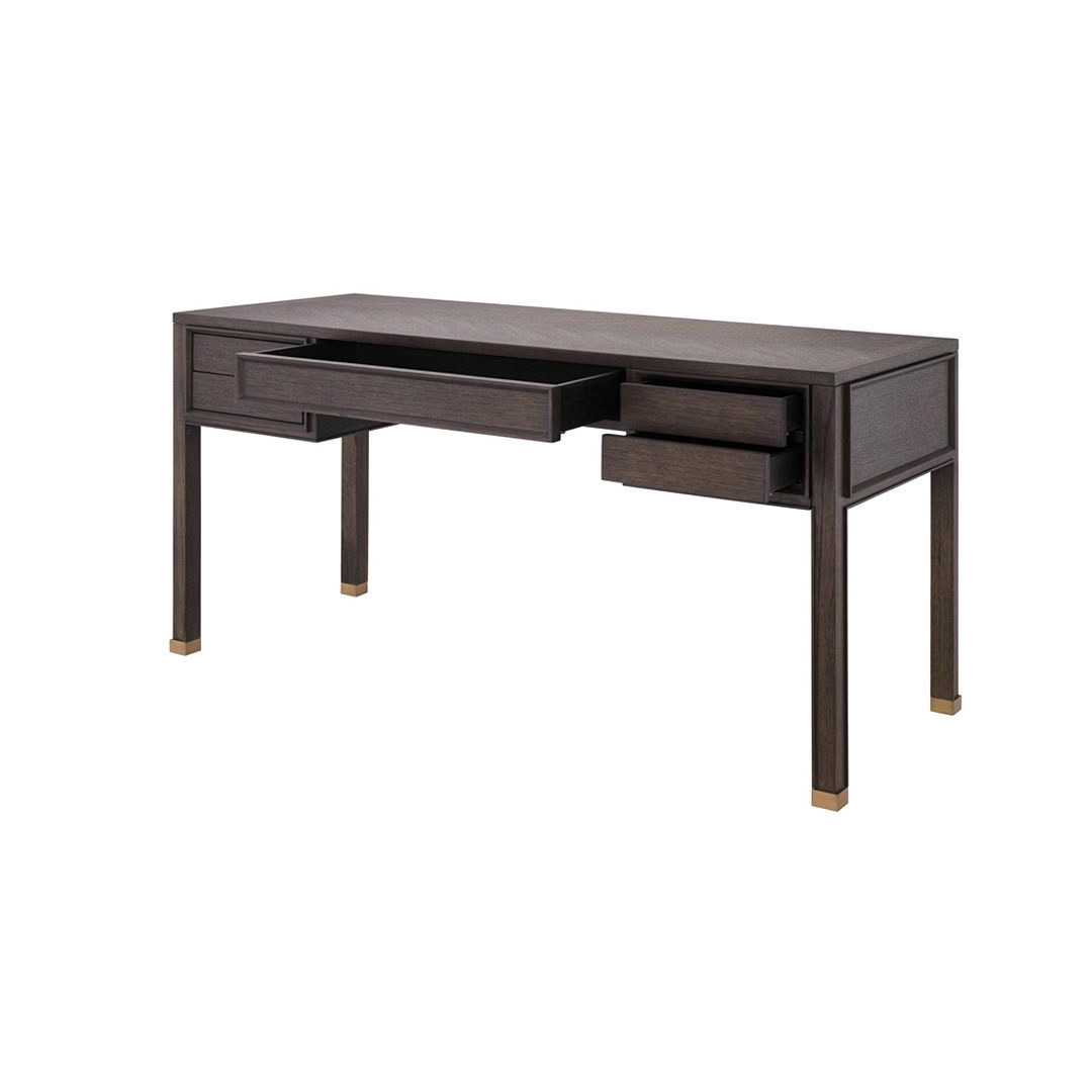The Melchior Desk effortly blends in a variety of décors, whether traditional or contemporary. Reminiscent of Danish design furniture from the 1950s, this stylish desk grants your home interior a genuine retro look and feel. The brown oak veneer tabletop showcases a beautiful geometric parquet pattern. It contains 5 drawers and rests on four legs with both protective and decorative caps of brushed brass.