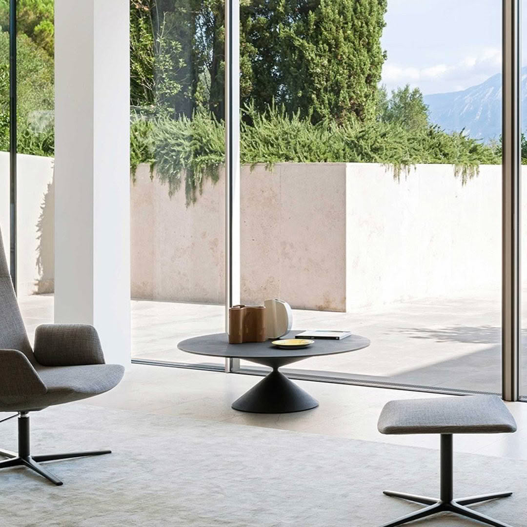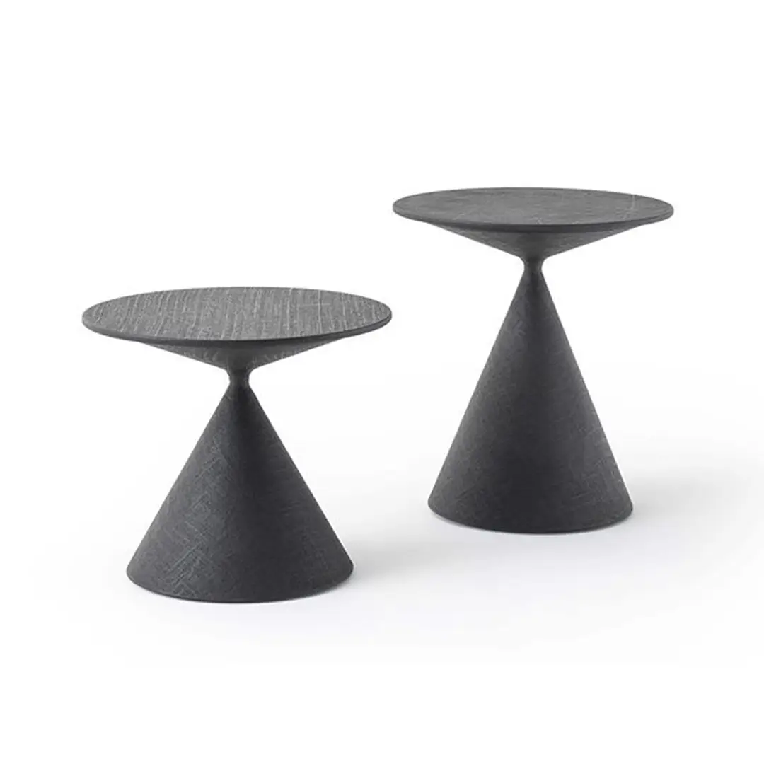 Mini Clay also wears the most recent Canvas finish: the elegant and light canvas capable of gracefully enhancing the sinuous design of the table. An original finish obtained from the interweaving of natural fibers, which surprises for its visual and tactile impact, the application of which is the result of skilfull craftsmanship.