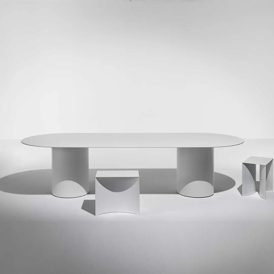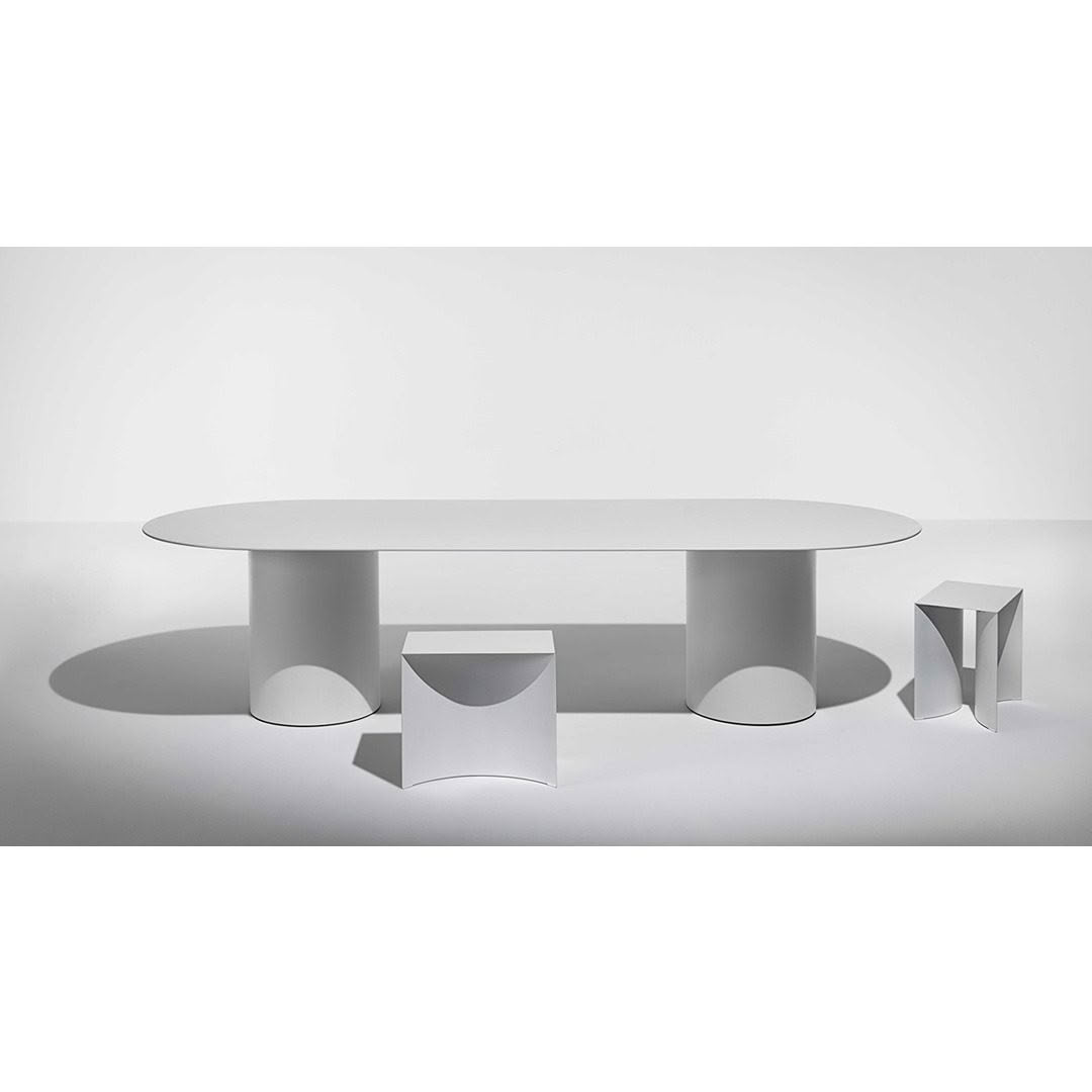 The MM8 table explores the limits of material in relation to its structural properties, exploiting the physical qualities of aluminium. The construction brings an overall tension to the structure, allowing the top to reach a minimum thickness of 8 mm.