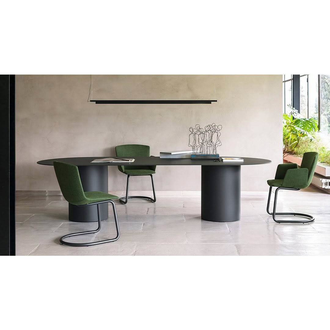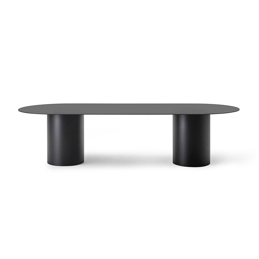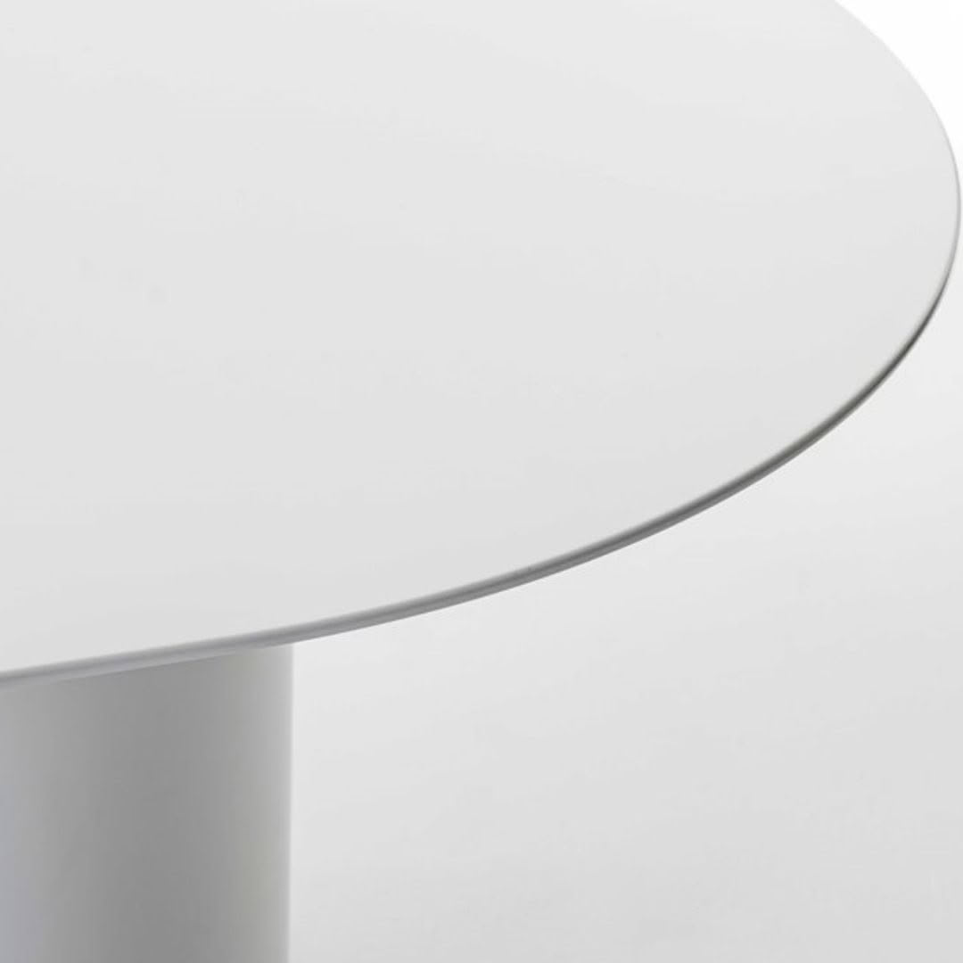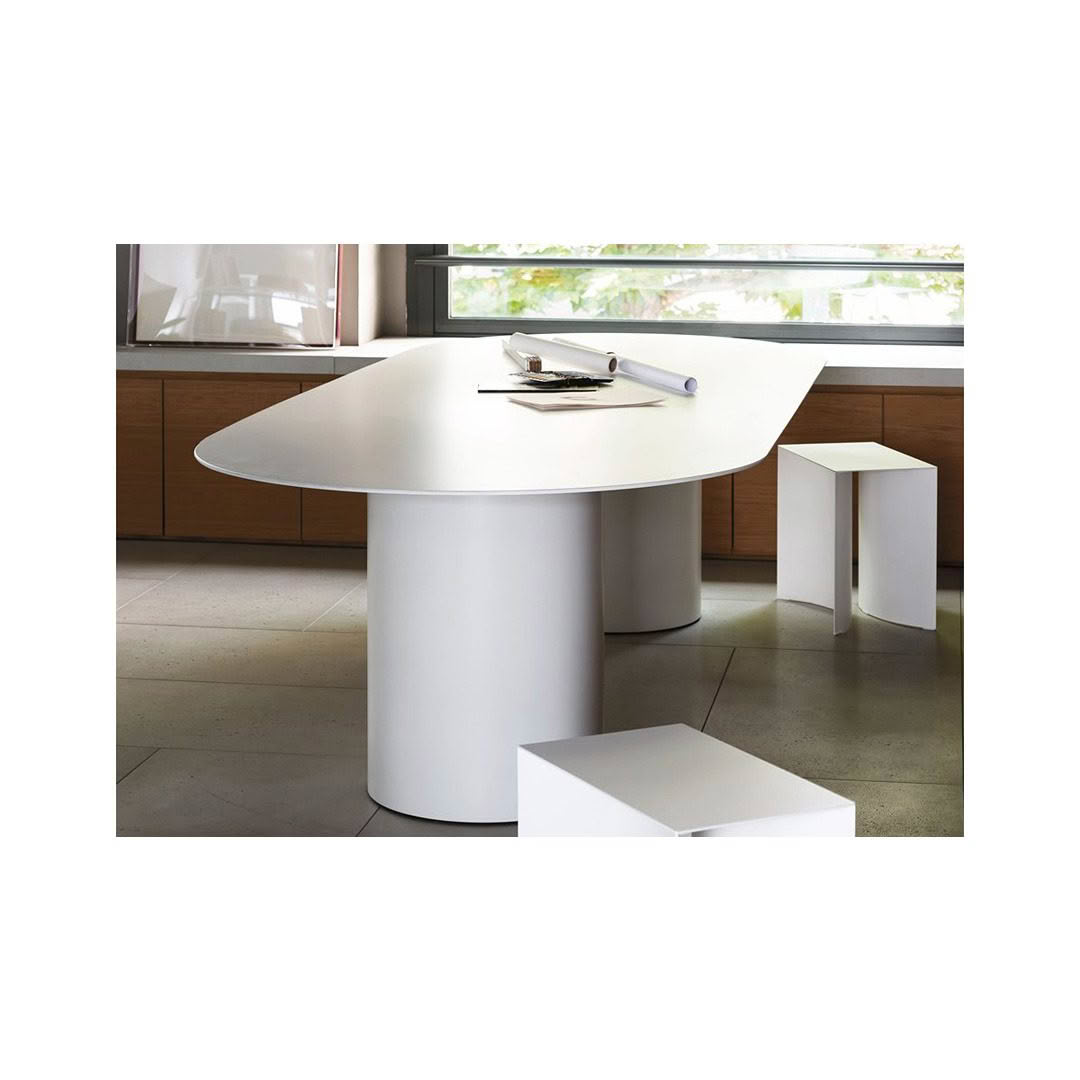 Lacquer finish table with 8 mm thick aluminium top and cylindrical double base.