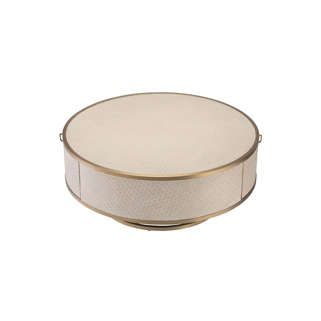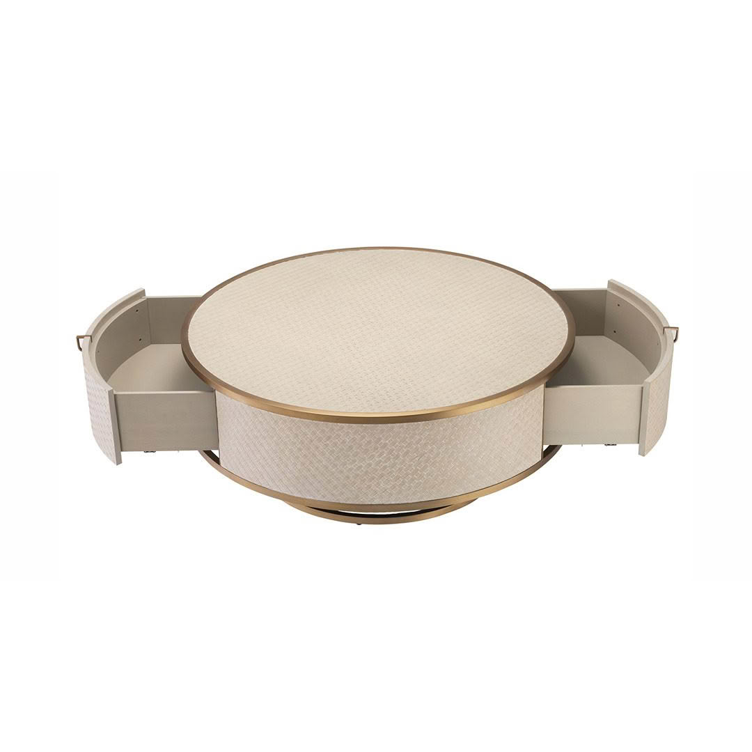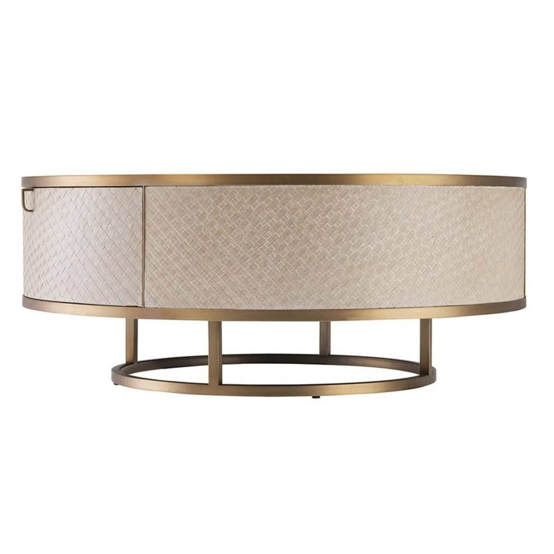 Pairing Bauhaus style with a Mid-Century Modern look, the beautiful drum-shaped Napa Valley Coffee Table features a stainless steel frame and is lined with woven oak veneer. Two large drawers with stainless steel handles offer ample storage space.