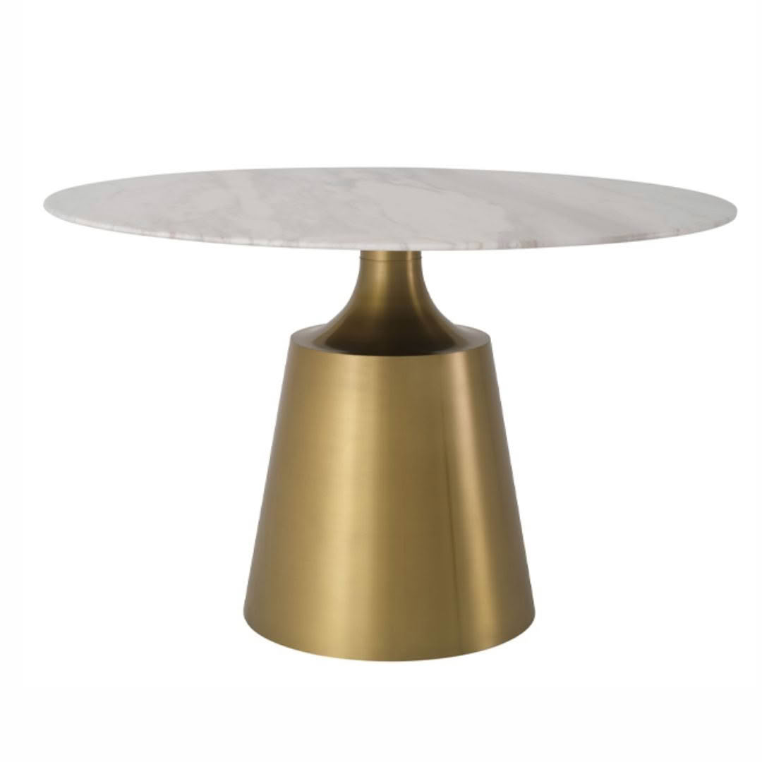 With its round marble top of white marble and tapered brass base, Dining Table Nathan encapsulates the essence of a contemporary design. Simple, elegant lines allow the noble material to take the spotlight. Decorate your home with this elegant piece for an undeniably distinguished look.
