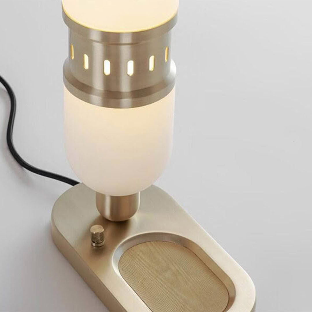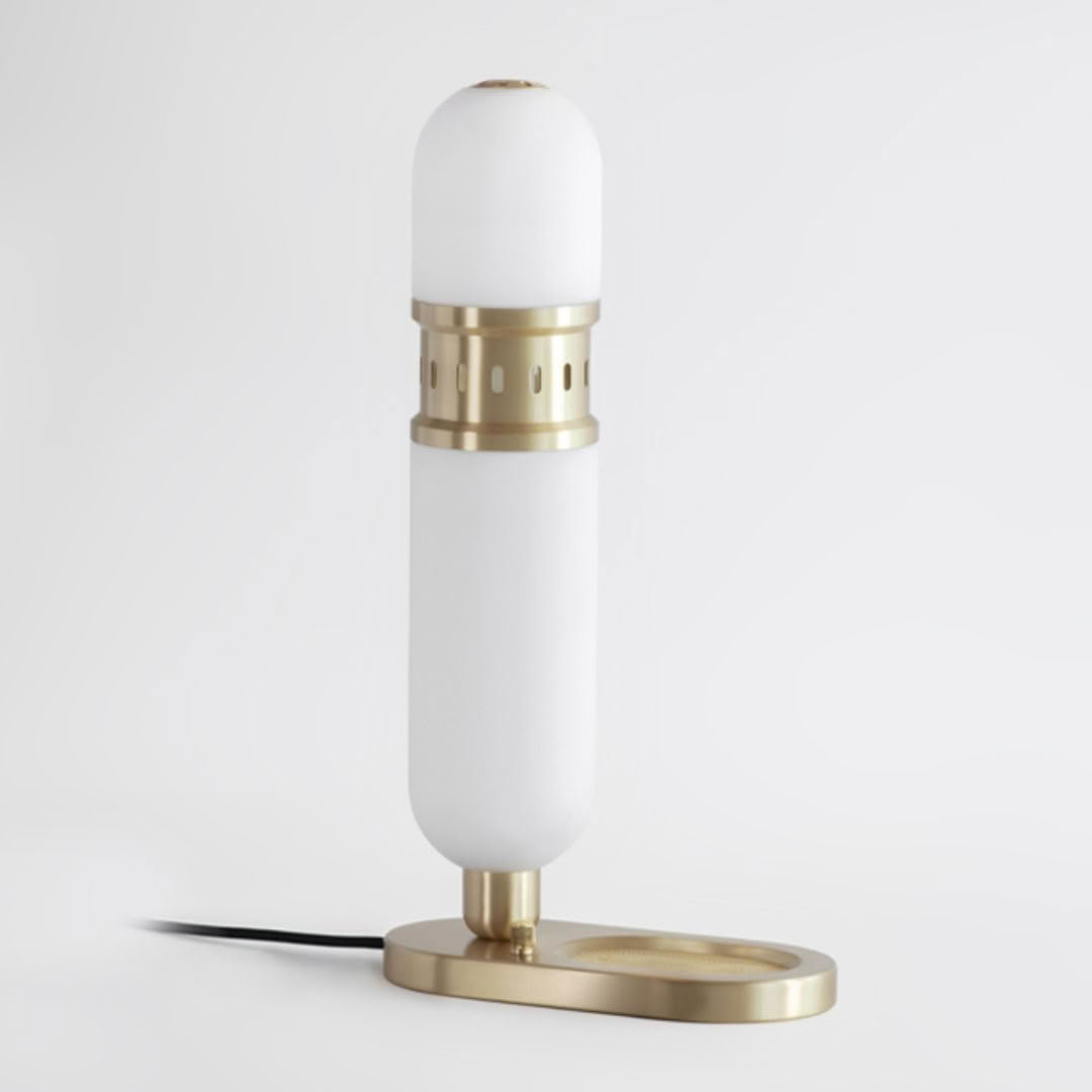 The pill-shaped opal glows with opulence, encased in a band of precision-machined brushed brass and sitting tall and proud on a thick solid brass base. The capsule lamp will complete your desk or bedside table, with a practical grooved tray machined into the base.