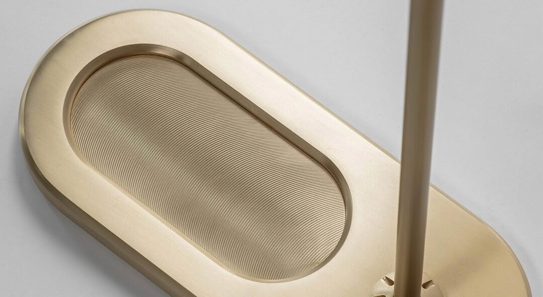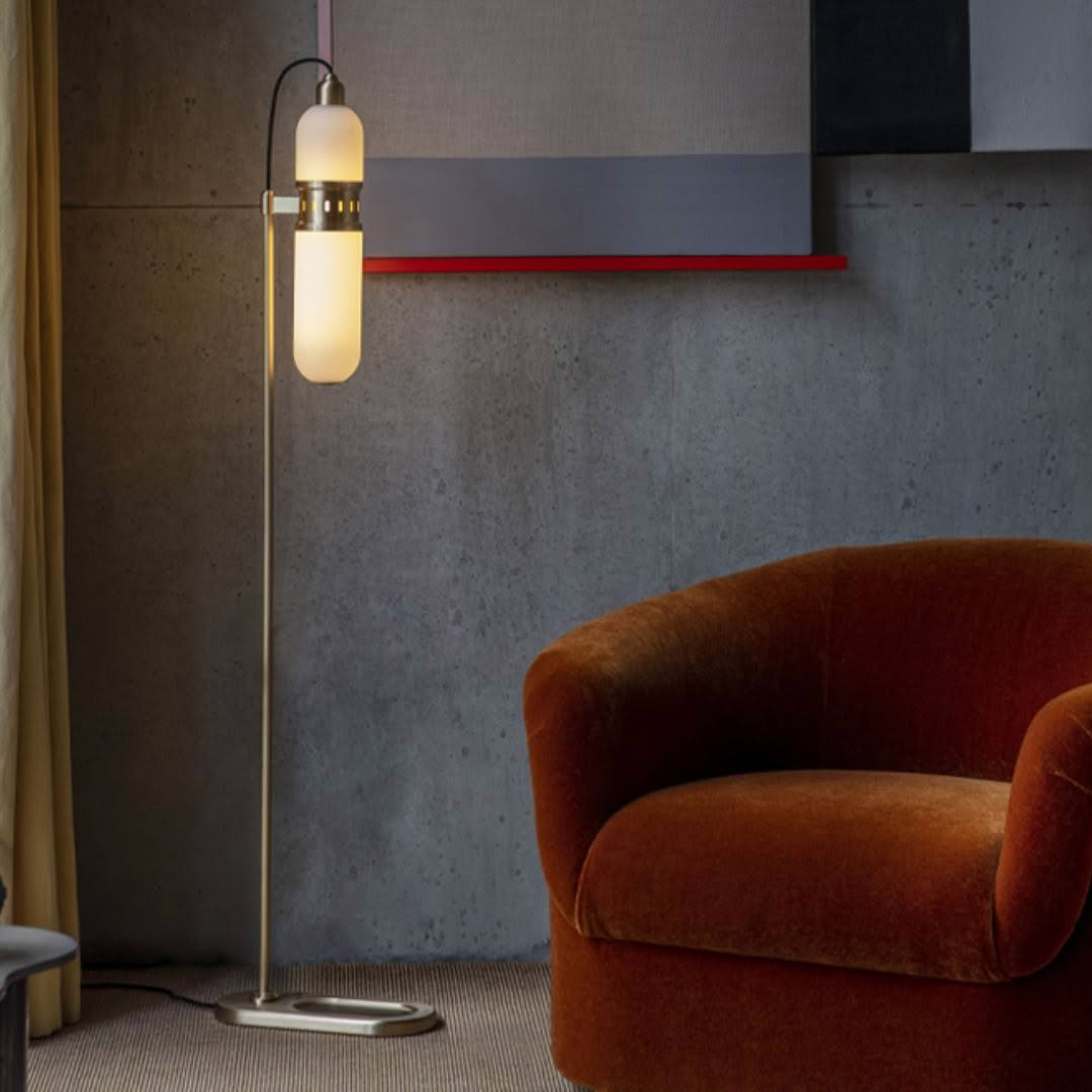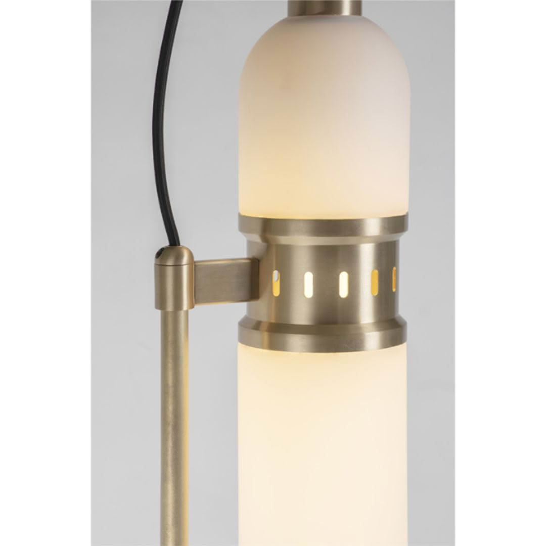 Soft opal capsule hangs gracefully from a swooping cord, fixed within a brushed brass stand. The weighty machined brass base features a grooved inlay, adding extra depth and texture. Perfectly fitting to a moody snug corner hung over a statement armchair.