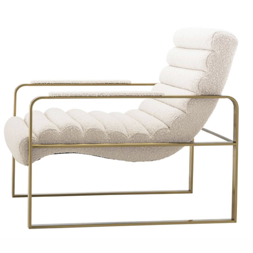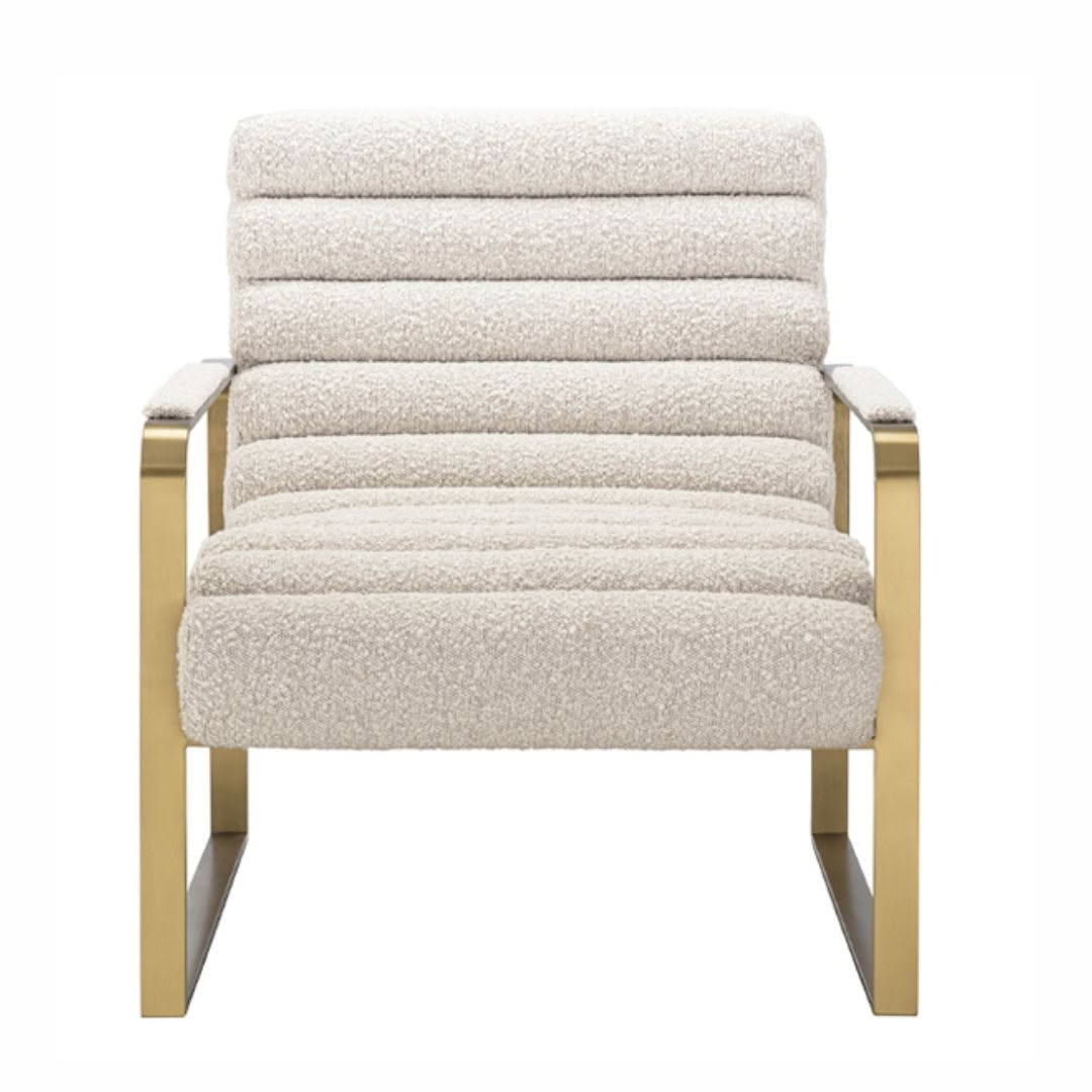 Reclined for ultimate comfort, Chair Olsen will turn relaxing into your favourite pastime. Slender yet strong, the brushed brass finish frame adds an industrial edge to the curvaceous seat. Its generous padding creates an inviting and soft cushioning while the durable bouclé cream upholstery gives it cuddliness.