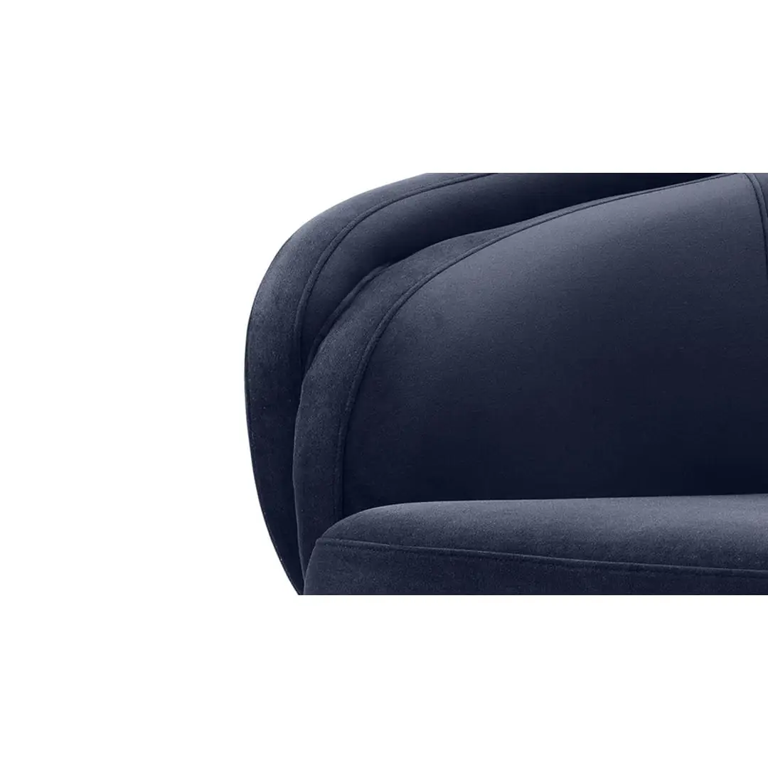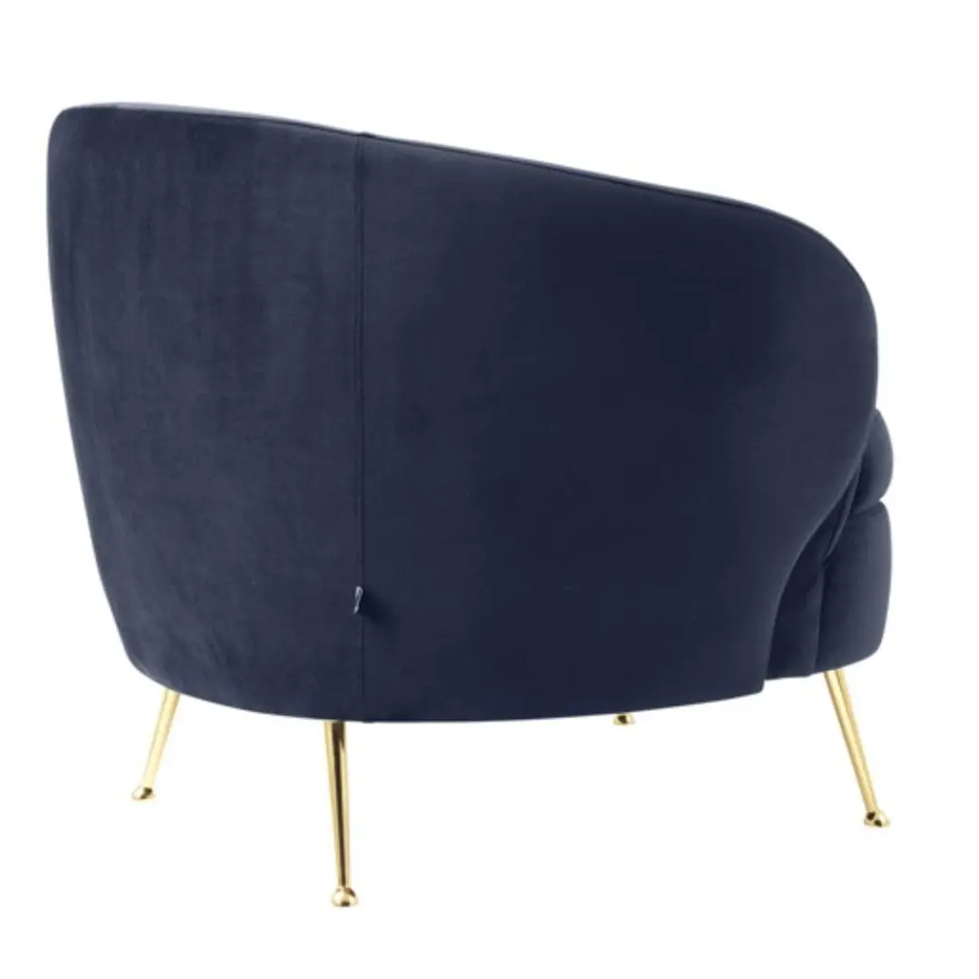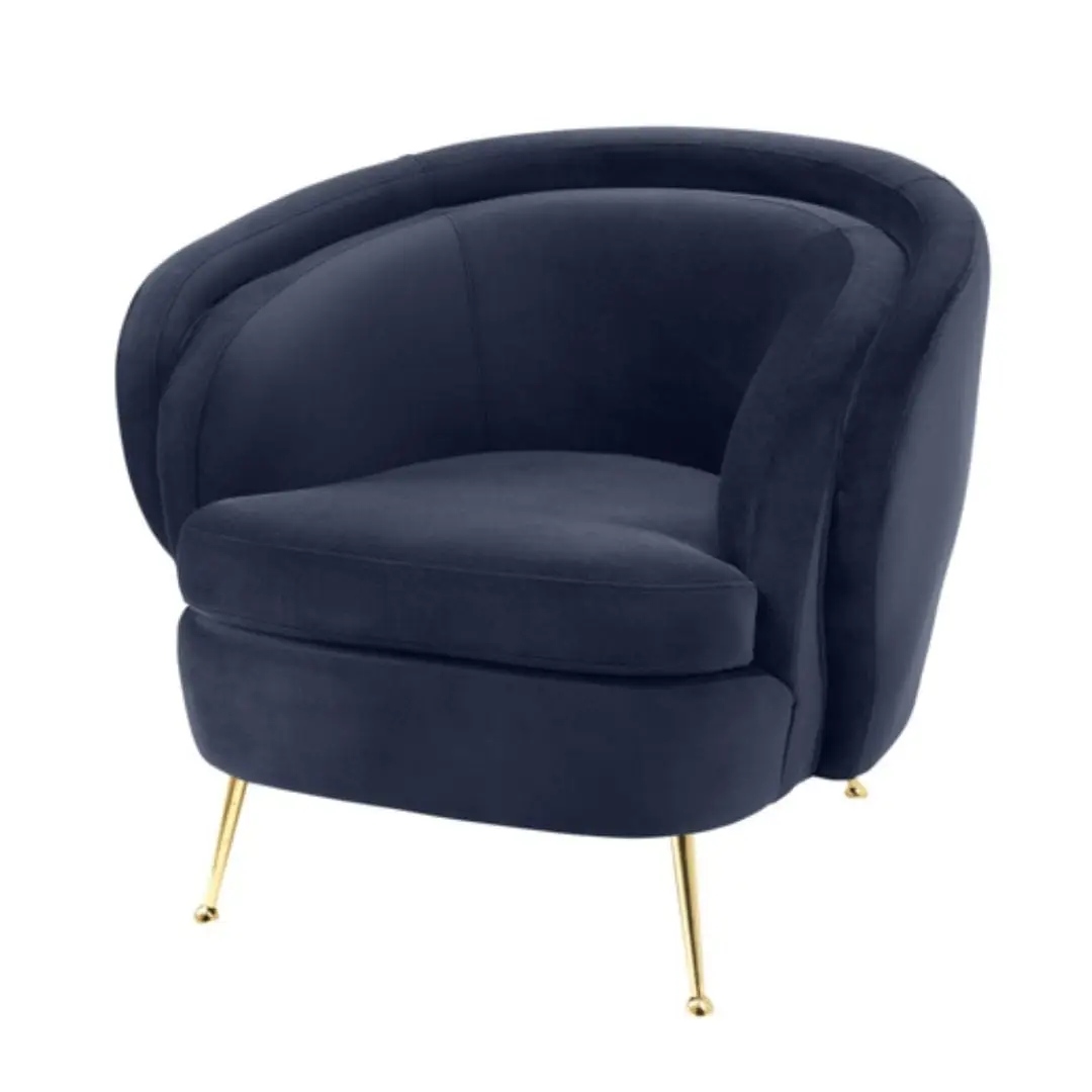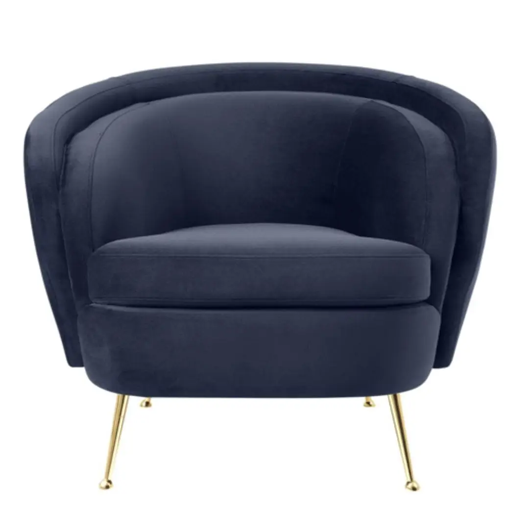 The distinguished Orion Chair features a stylish double backrest. This attractive chair brings a splash of retro style to your home interior. Its clean lines and soft curves contribute to its Mid-Century Modern look, while its Savona midnight blue velvet upholstery and tapered brass legs round out the design.
