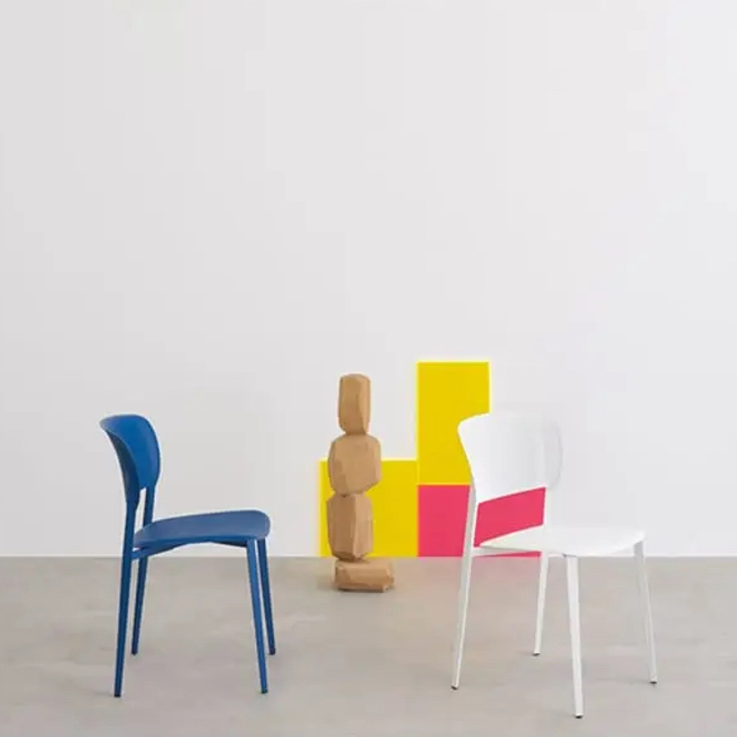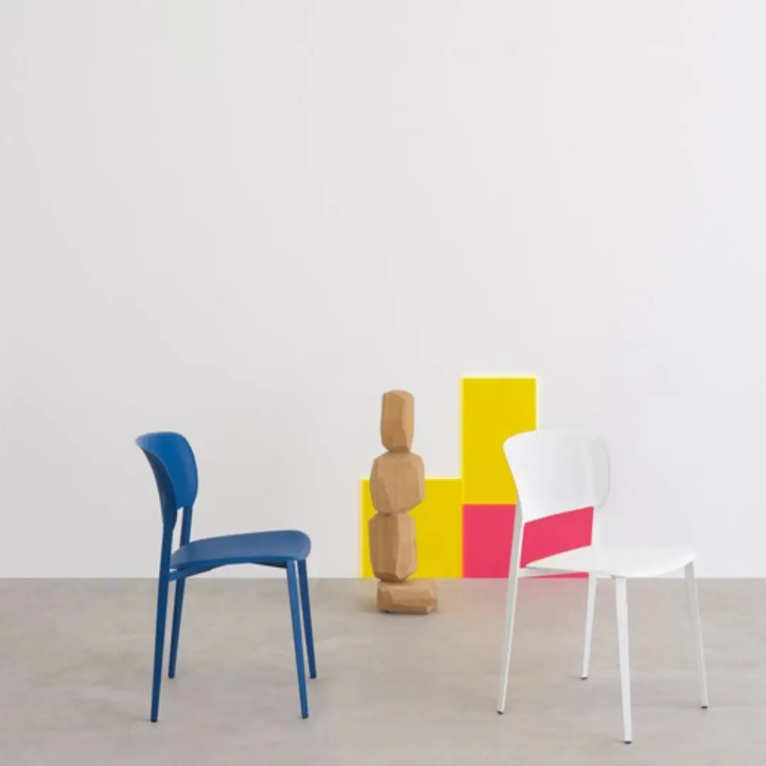 Stacking chair with steel frame lacquered in the same colours of the seat. Seat and back made of polypropylene with glass bre. The polypropylene has been stabilised anti-UV. Steel legs in conic shape with triangular section.