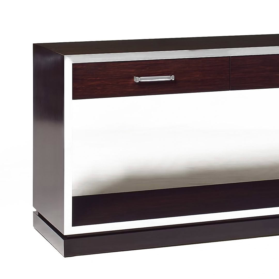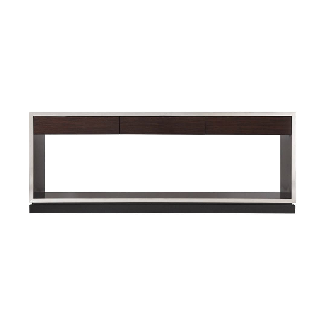 Elevated upon a hand-finished plinth base, Ralph Lauren’s Pryce console table is expertly crafted with a hand-selected quartered rosewood veneers and polished stainless steel trim. Strikingly modern with Art Deco–inspired elements, the well-balanced form features three drawers with soft-close glides and hardware forged by hand.