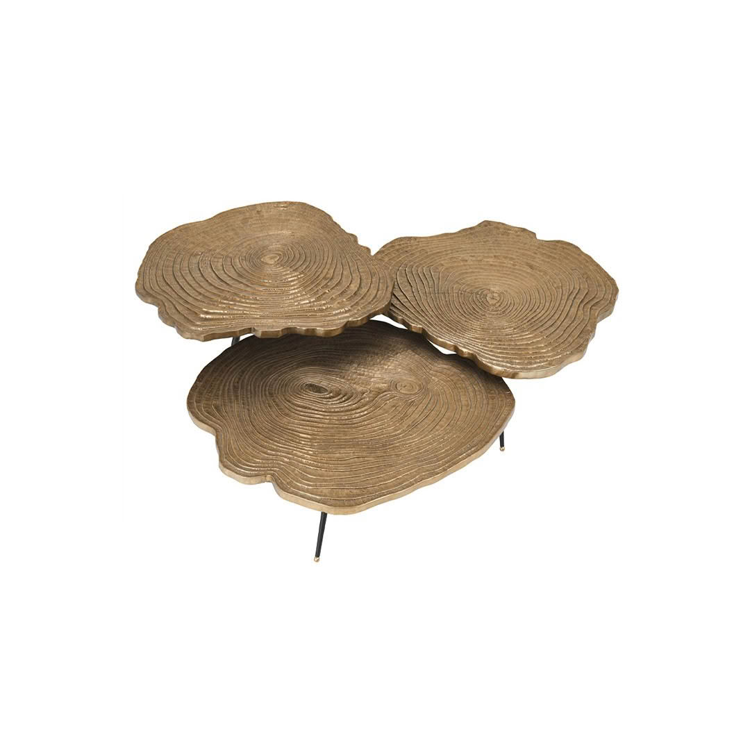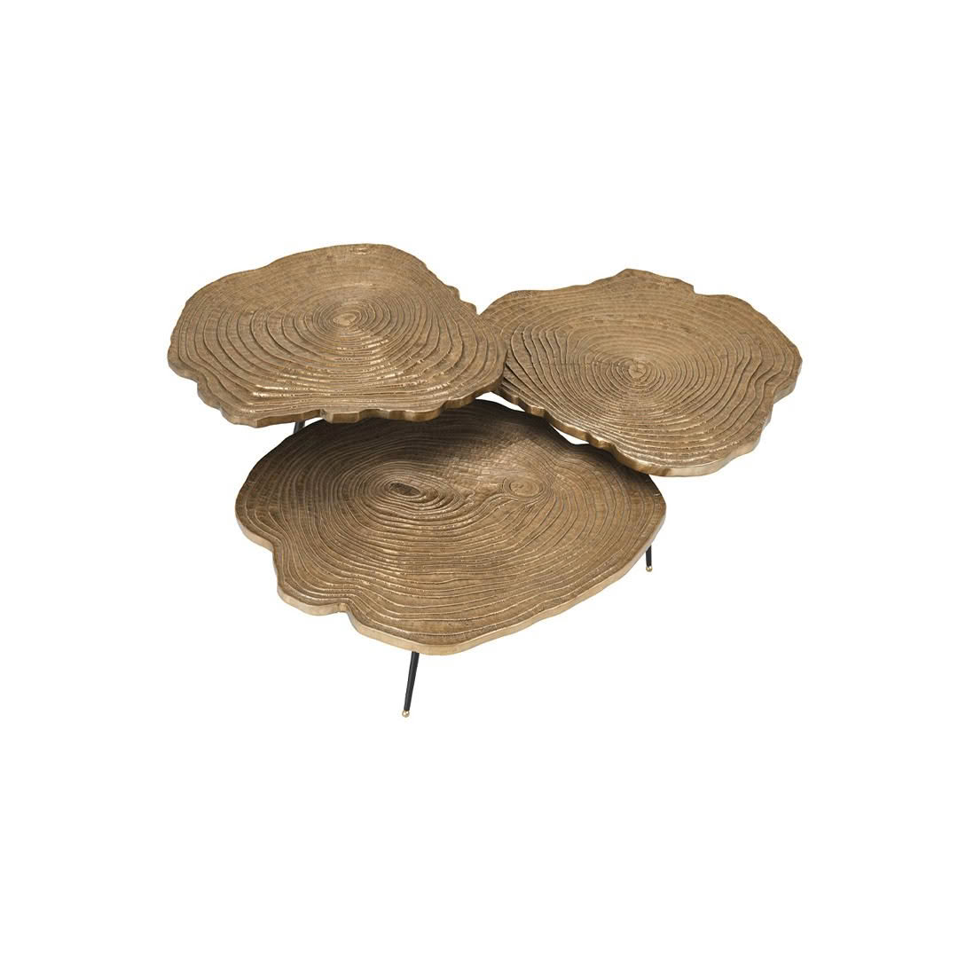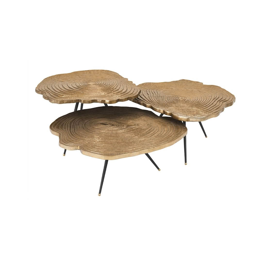 The structure of wood grains grant a unique appearance to the set of 3 Quercus Coffee Tables. Featuring wooden table tops with a bronze finish, these distinctive coffee tables are suitable for a variety of interior styles and colour schemes. The tables vary in height and feature black legs.
