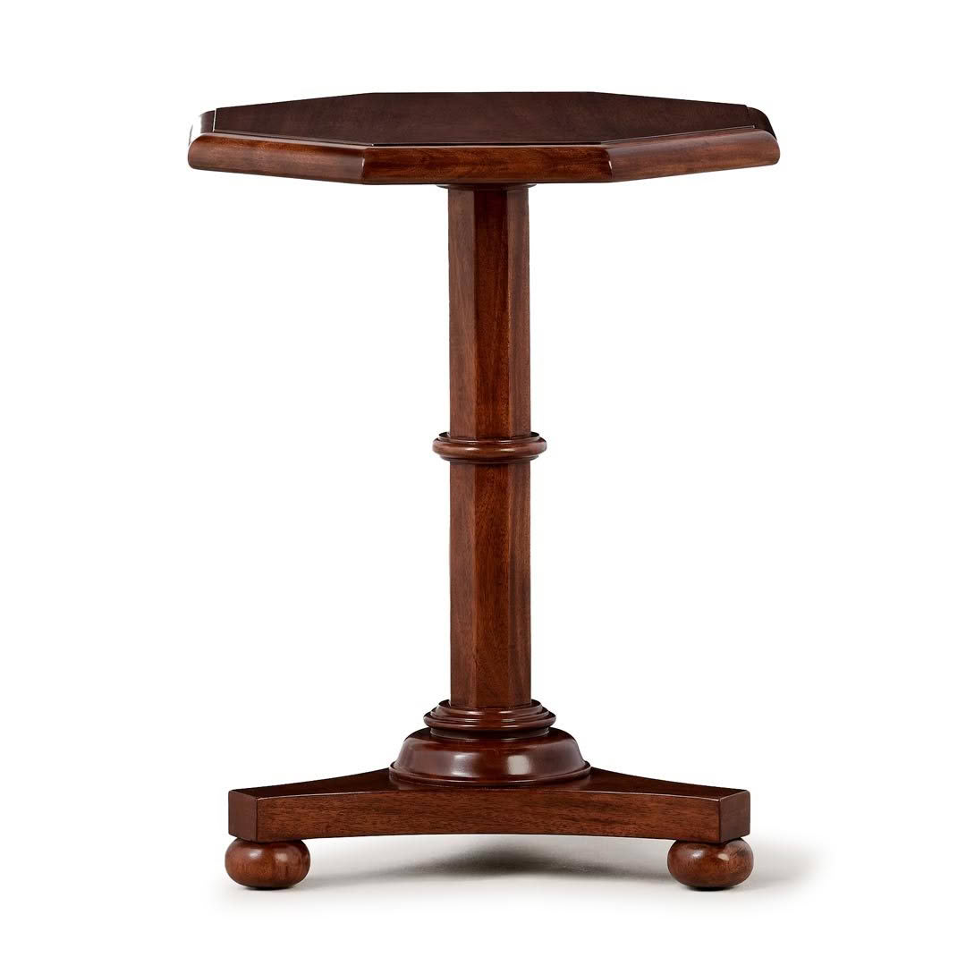 This versatile accent table is crafted from solid wood with a hand-applied finish that imparts rich dimension. Resting on classic bun feet with a tripod base, the pillar and top are defined by distinct octagonal contours.