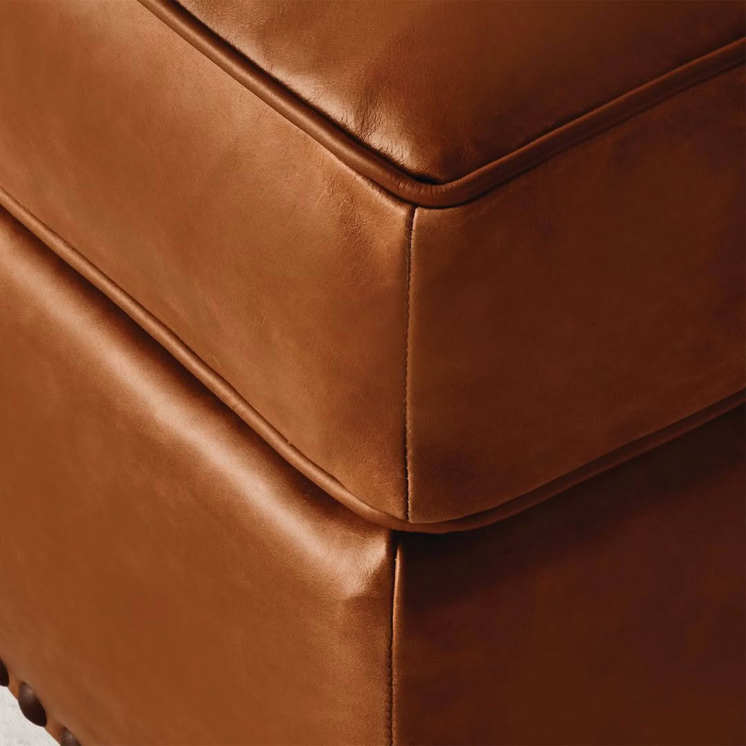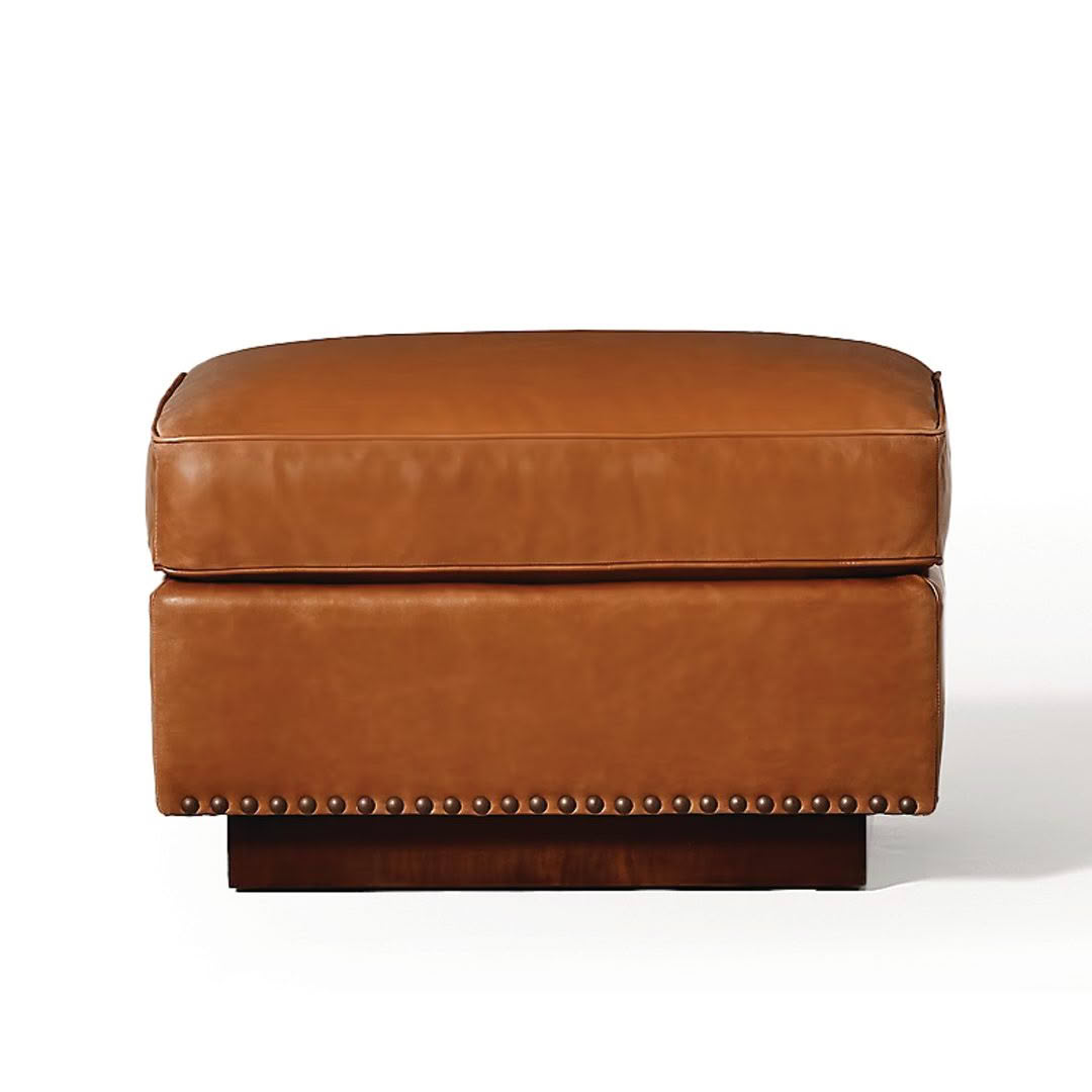 Grounded in American West design elements—an enduring source of inspiration for Mr. Lauren—this 1940s-style ottoman is hand-upholstered in soft cowhide with bold nail-head trim and classic single-welt edges. The plush spring-down cushion is supported by a solid maple wood plinth base.