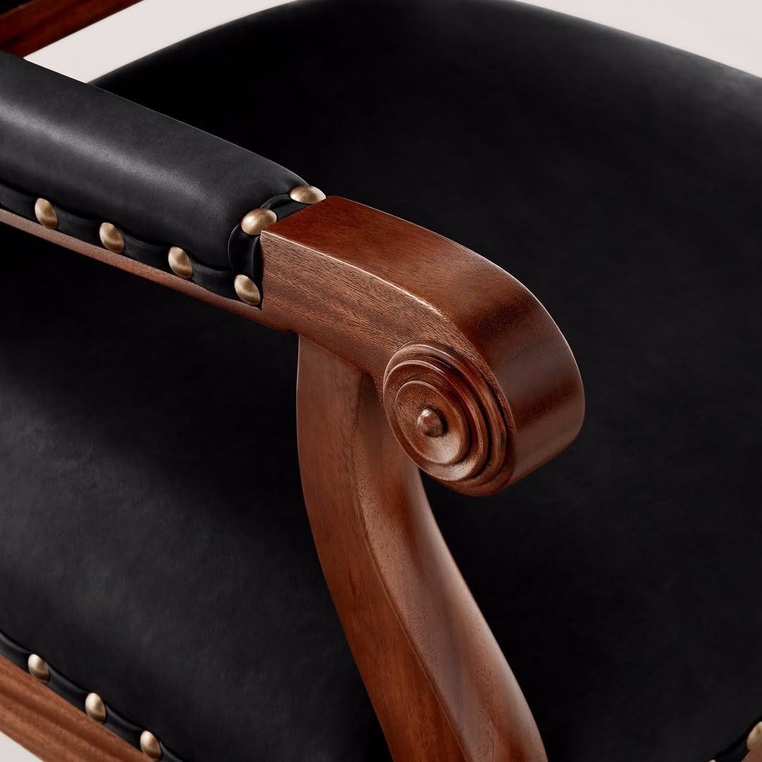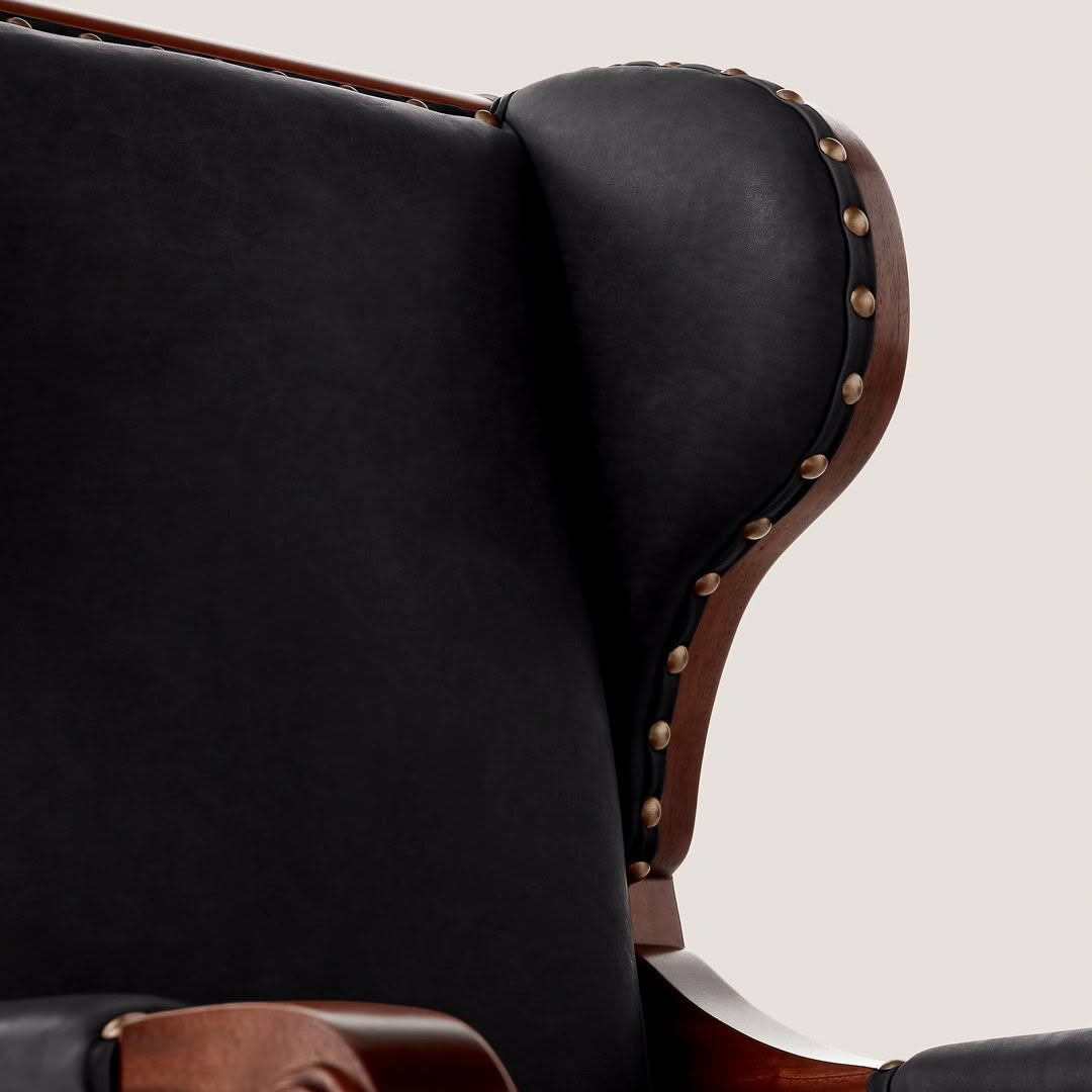 This Biedermeier-style wing chair features an exposed wood frame with hand-carved arms and turned legs. The upholstered cushions are accented by classic nailhead trim.