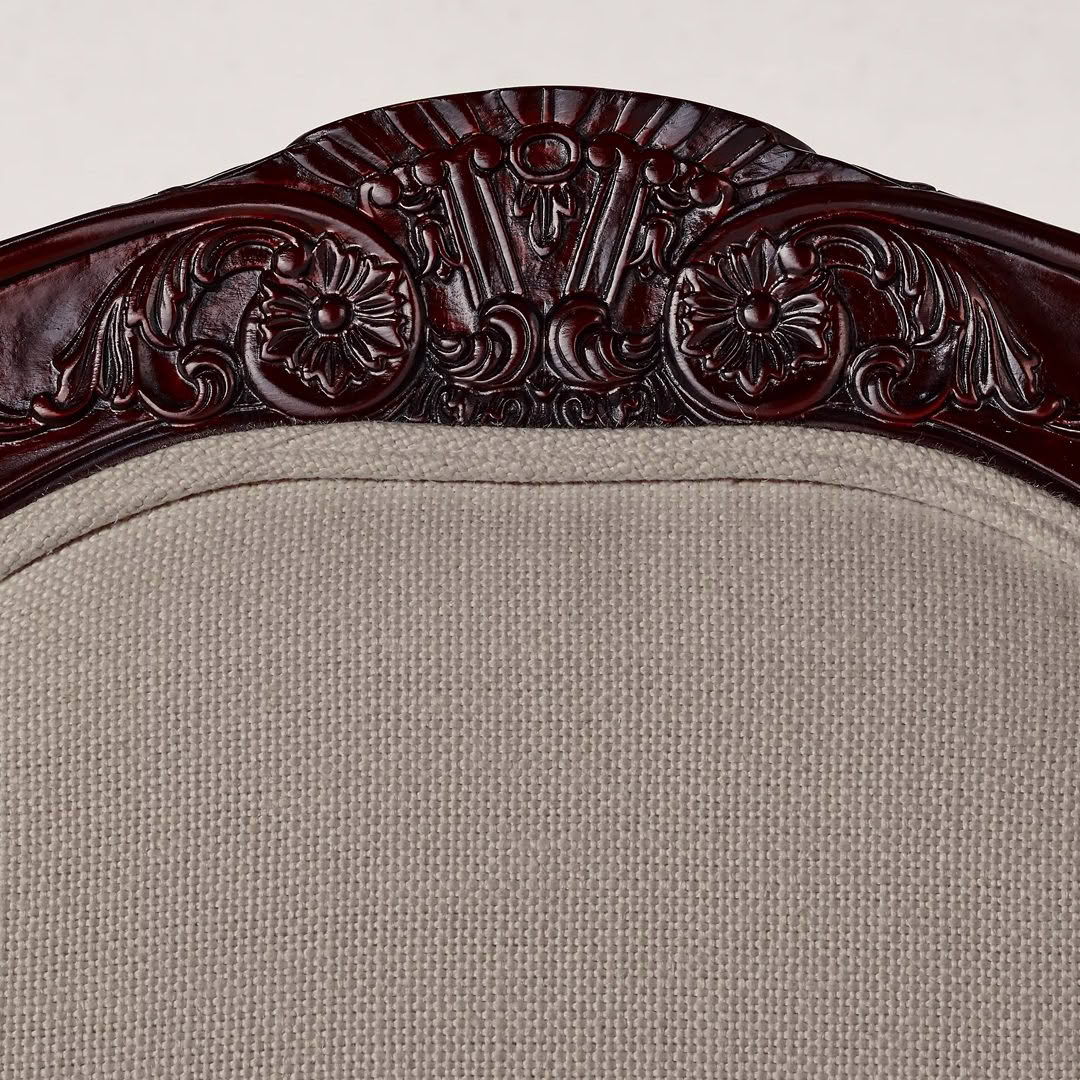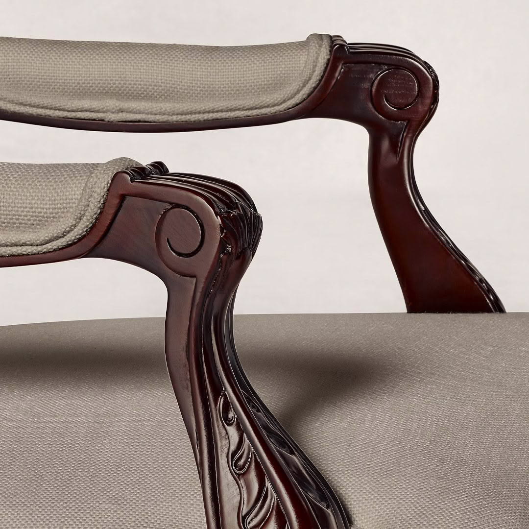 Drawing influence from Louis XV–style fauteuils, this open-arm chair is crafted from solid wood with exquisite hand-done rococo carvings throughout. Supple linen upholstery complements the ornate silhouette.