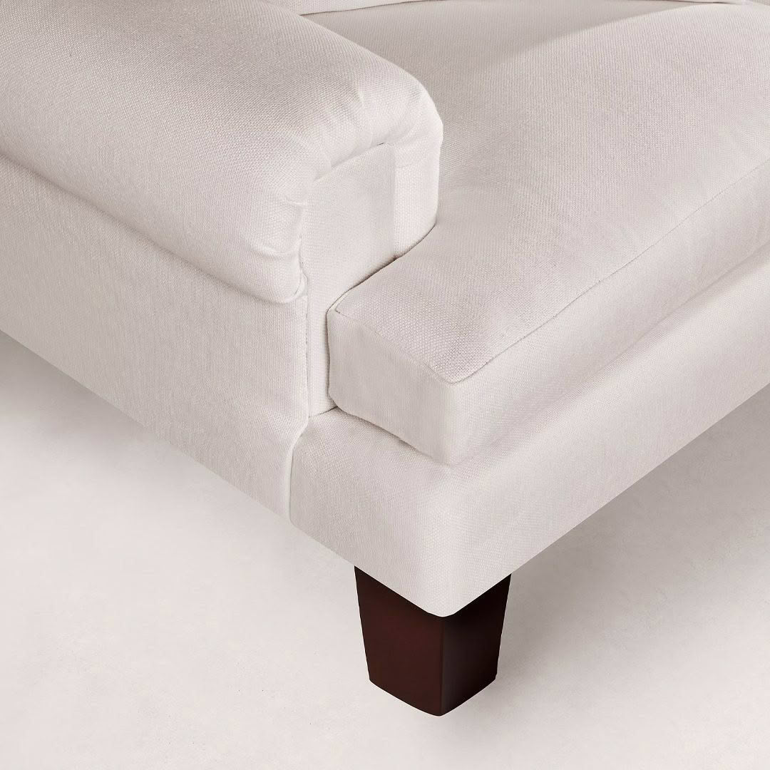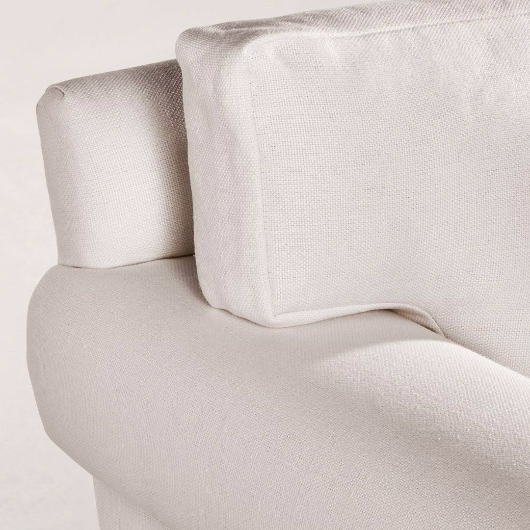 The club-style Penthouse Suite sofa features a three-seat silhouette with plush spring-down cushioning and Art Deco–inspired squared arms. Solid wood tapered legs can be draped with an upholstered skirt for a tailored finish.