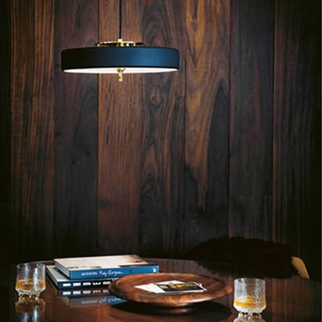 Casting a warm glow through its opal diffuser light also escapes through the top brass feature of the Revolve Pendant Lamp, highlighting the elegant, spun metal shade.