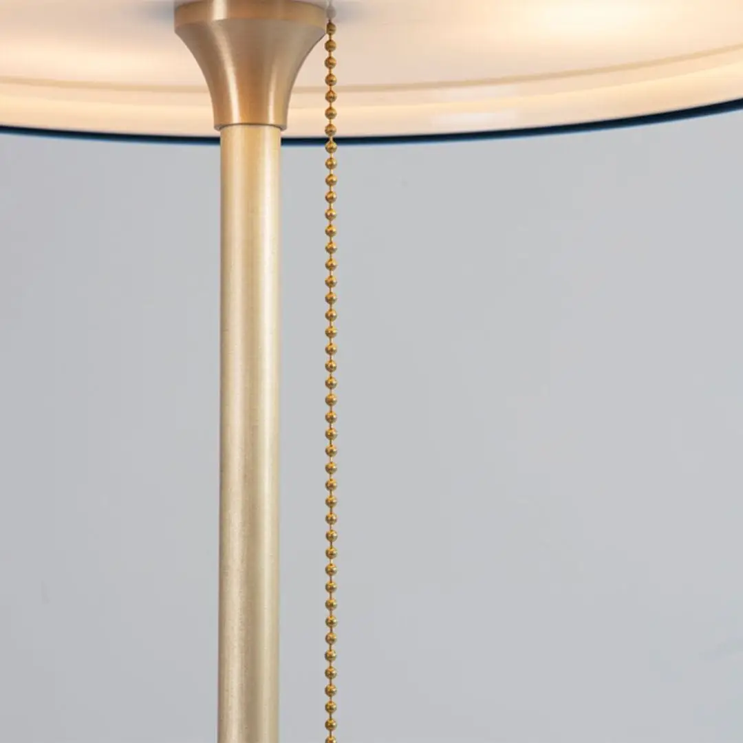 Sleek, minimalist design. Overhanging matte-lacquered spun metal shade with hand-brushed brass stand and solid brass base featuring matching colour-coded detail. Brass pull-chain switch.