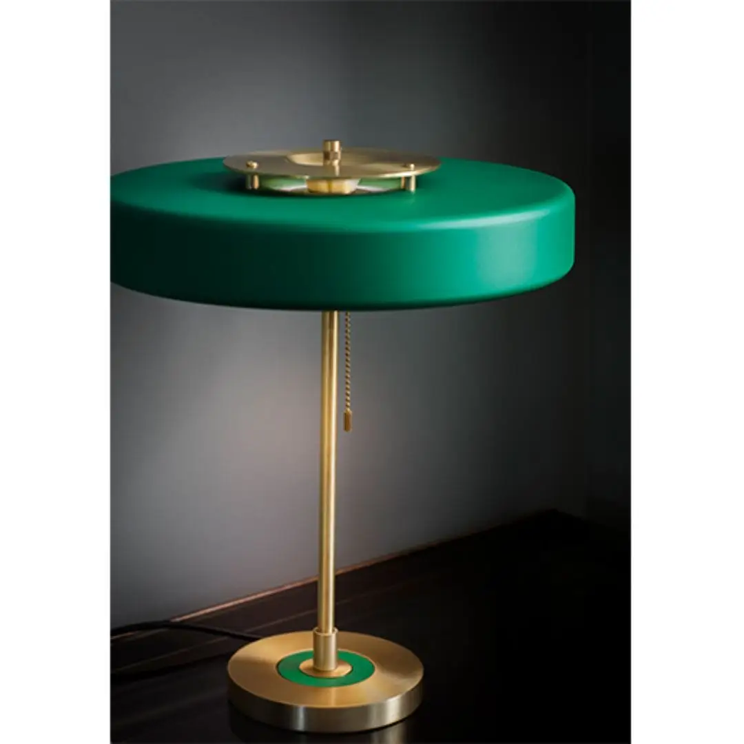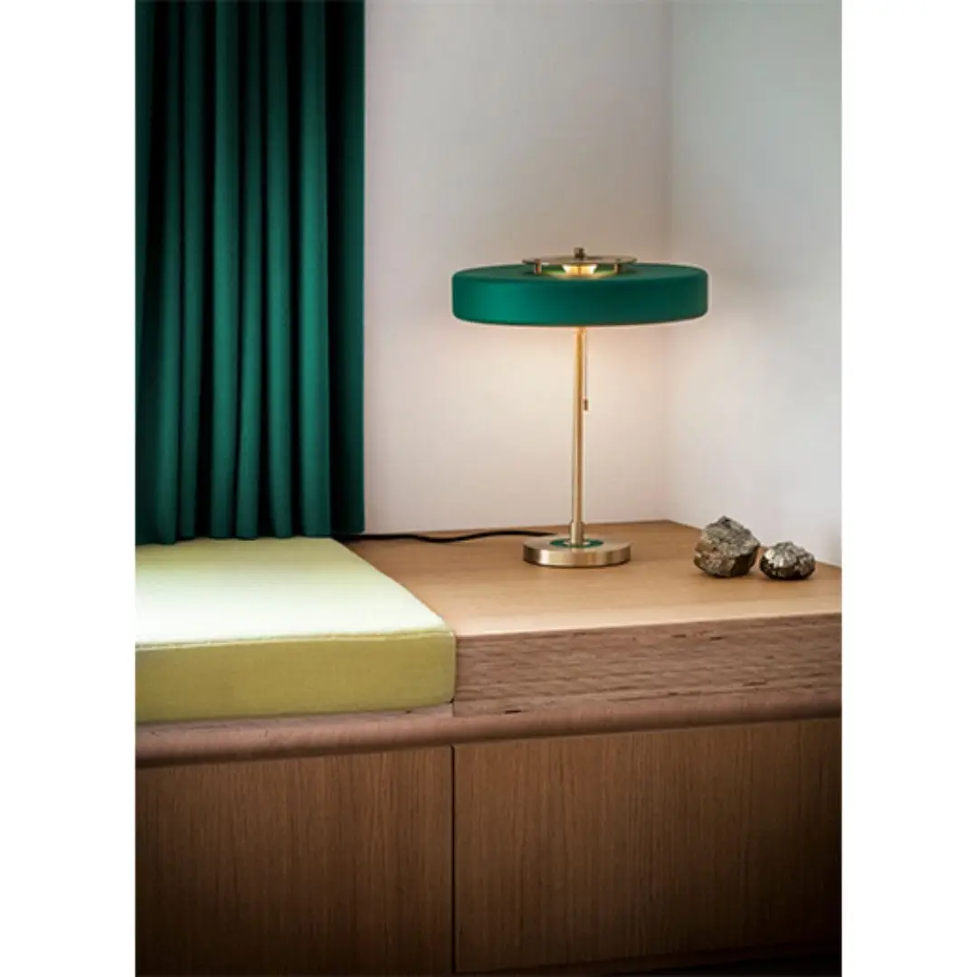 Offering a soft down light as well as top finial highlights, the Revolve Table Lamp makes a striking accent piece. A brass pull chain switch hangs over a solid brass base which features an inset colour ring to match the shade.
