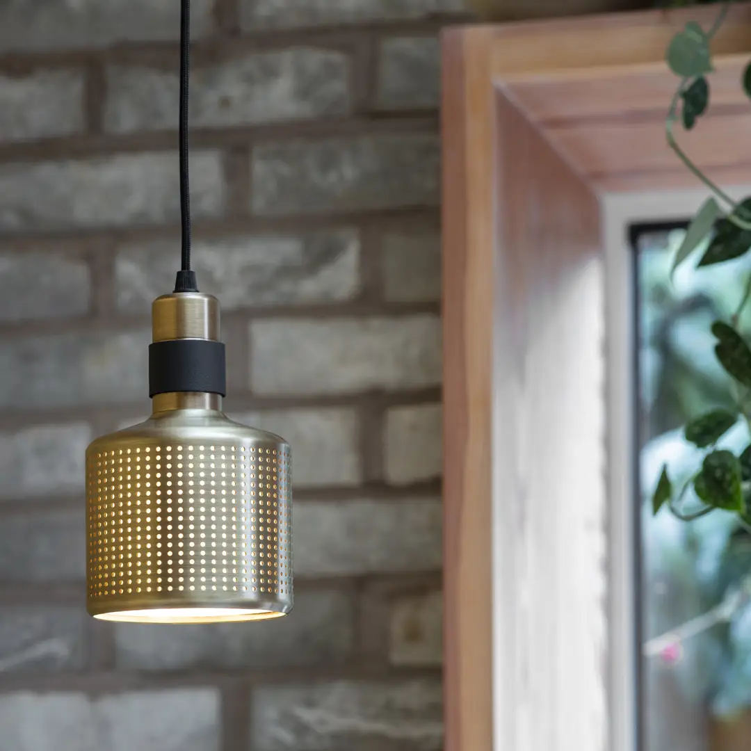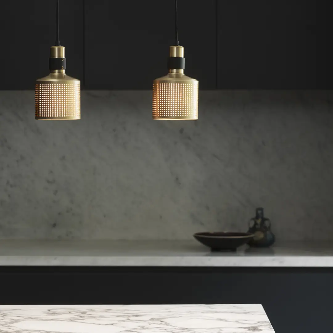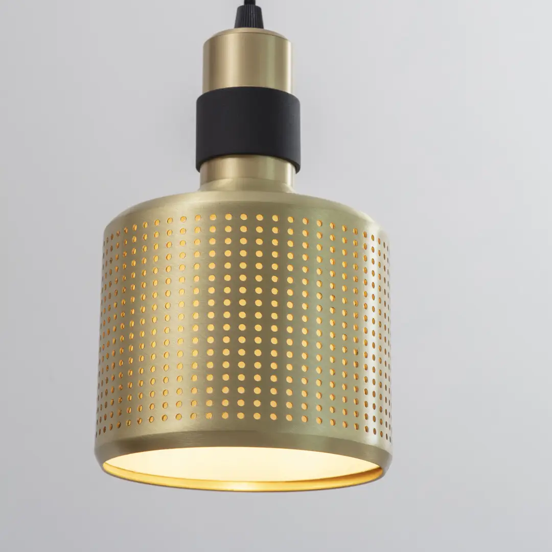 Featuring a perforated machined brass shade with a fabric insert,  the Riddle Pendant Lamp casts a soft, warm light. The ideal design to position over a bedside, kitchen island or breakfast bar.