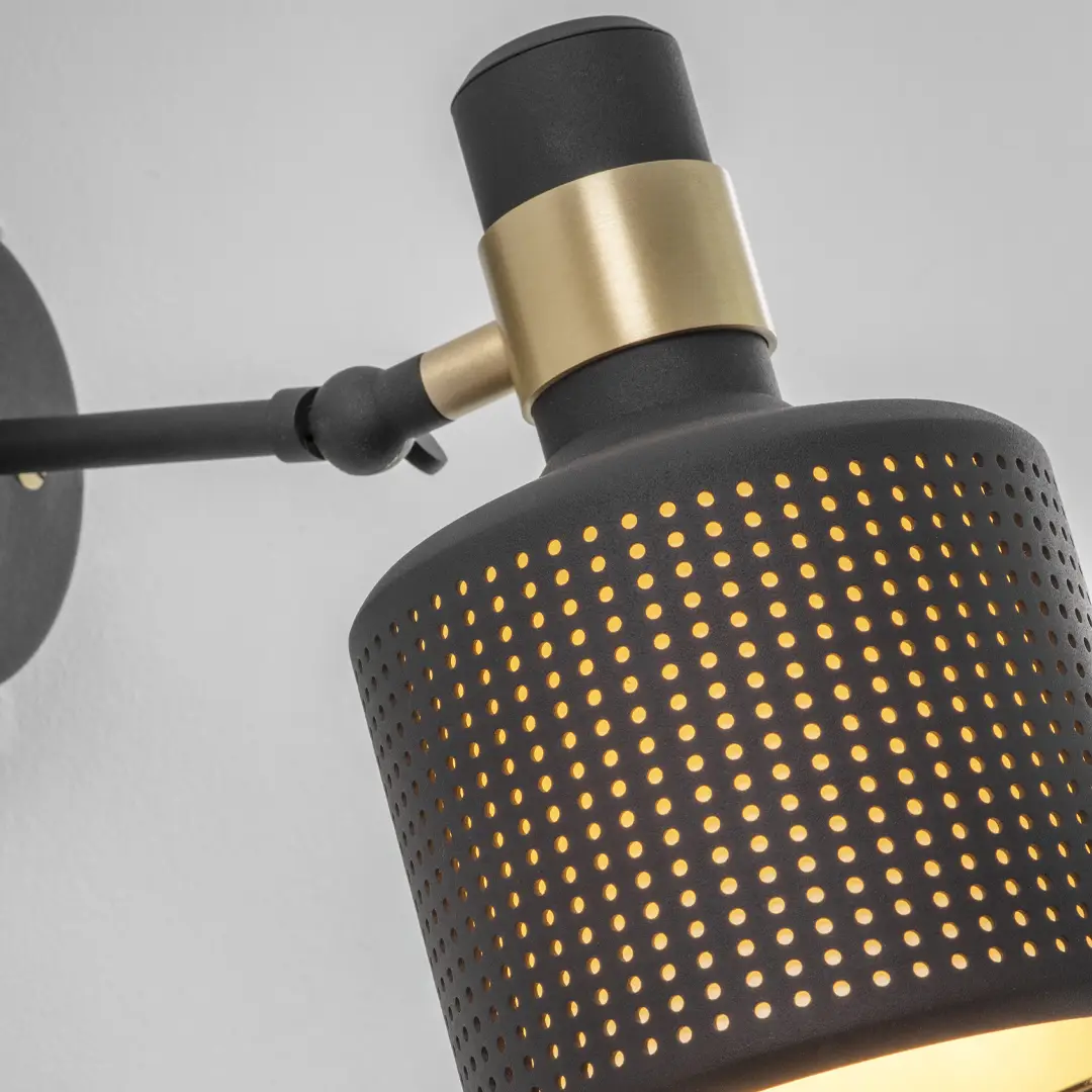 Adjustable, perforated machined-brass shade with a fabric insert that emits a soft light that can be directed to wash the wall or positioned to highlight a desired area.