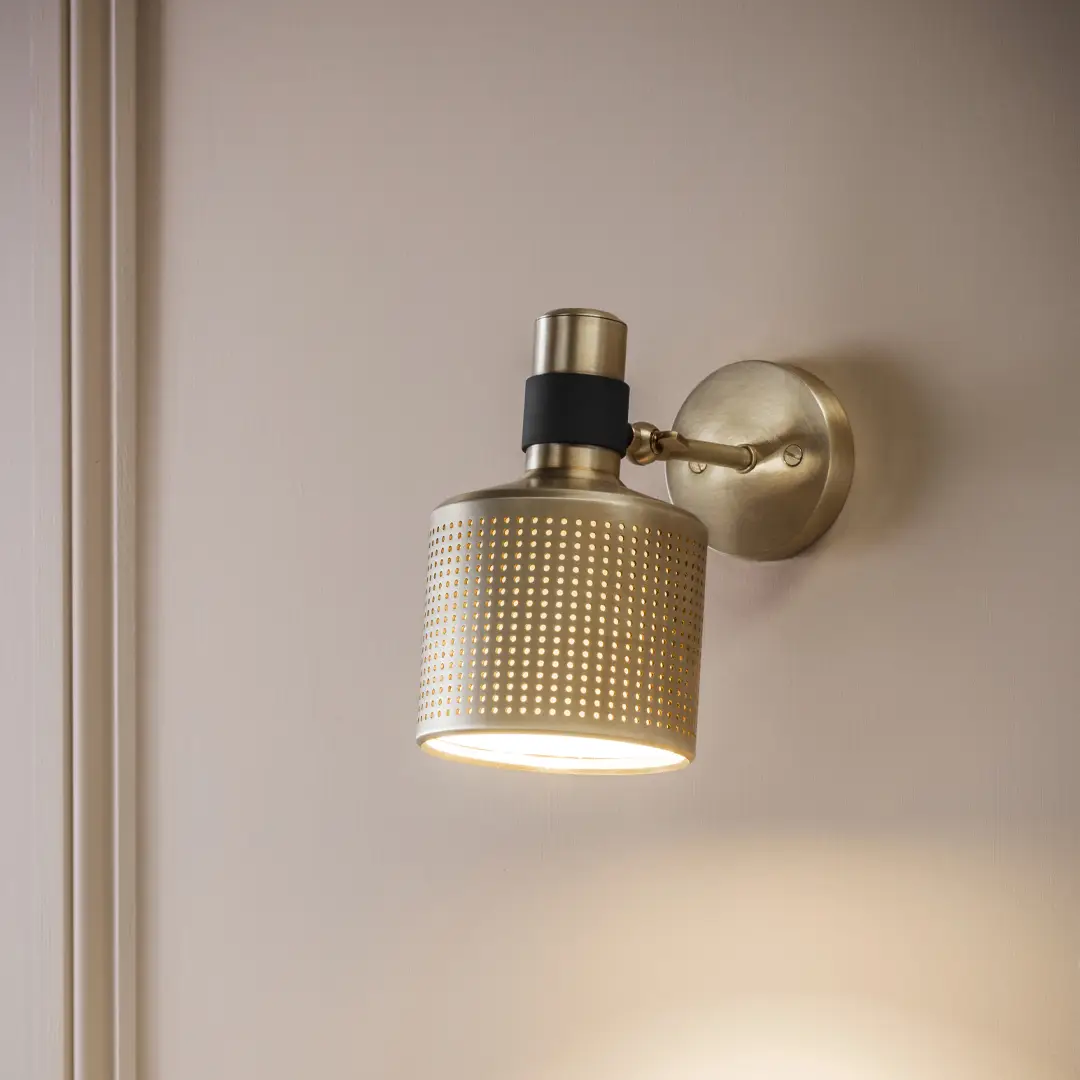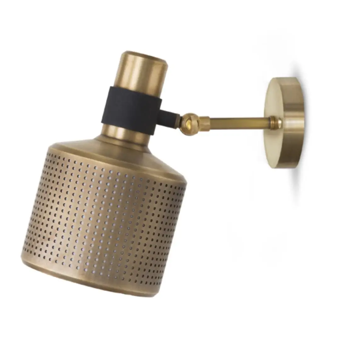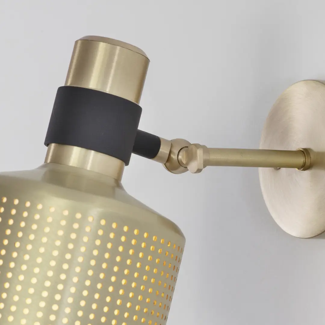 Featuring an adjustable, perforated machined brass shade with a fabric insert, the Riddle Single Wall Light emits a soft light that can be directed to wash the wall or positioned away to highlight a desired area.