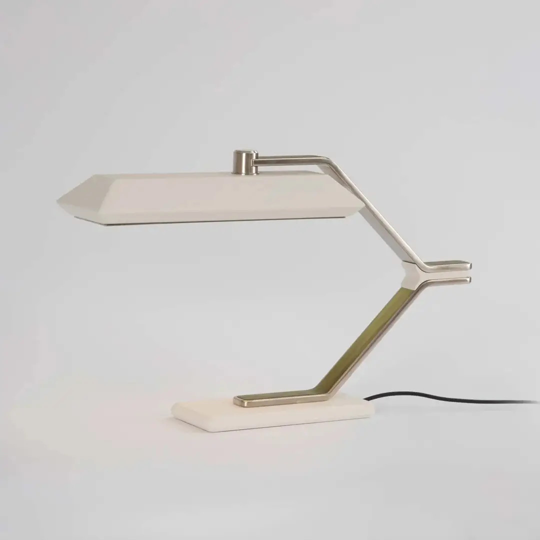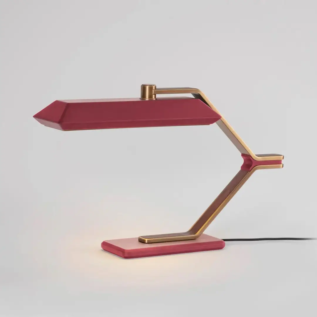 The distinctive angular frame of the Rinato Table Lamp is combined with the signature powder-coated, stainless steel light shade from the range, supported with a solid brass base. A task light suitable for a home office, workspace or hospitality setting, the Table Lamp’s shade and metalwork are available in a number of different finishes and the brass fixture features a decorative strip of premium leather, available in a variety of colours for a personal, sophisticated touch.