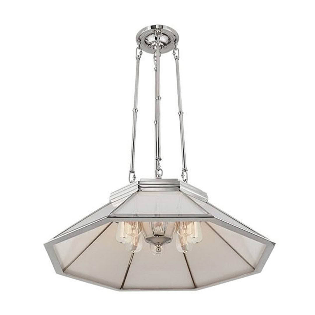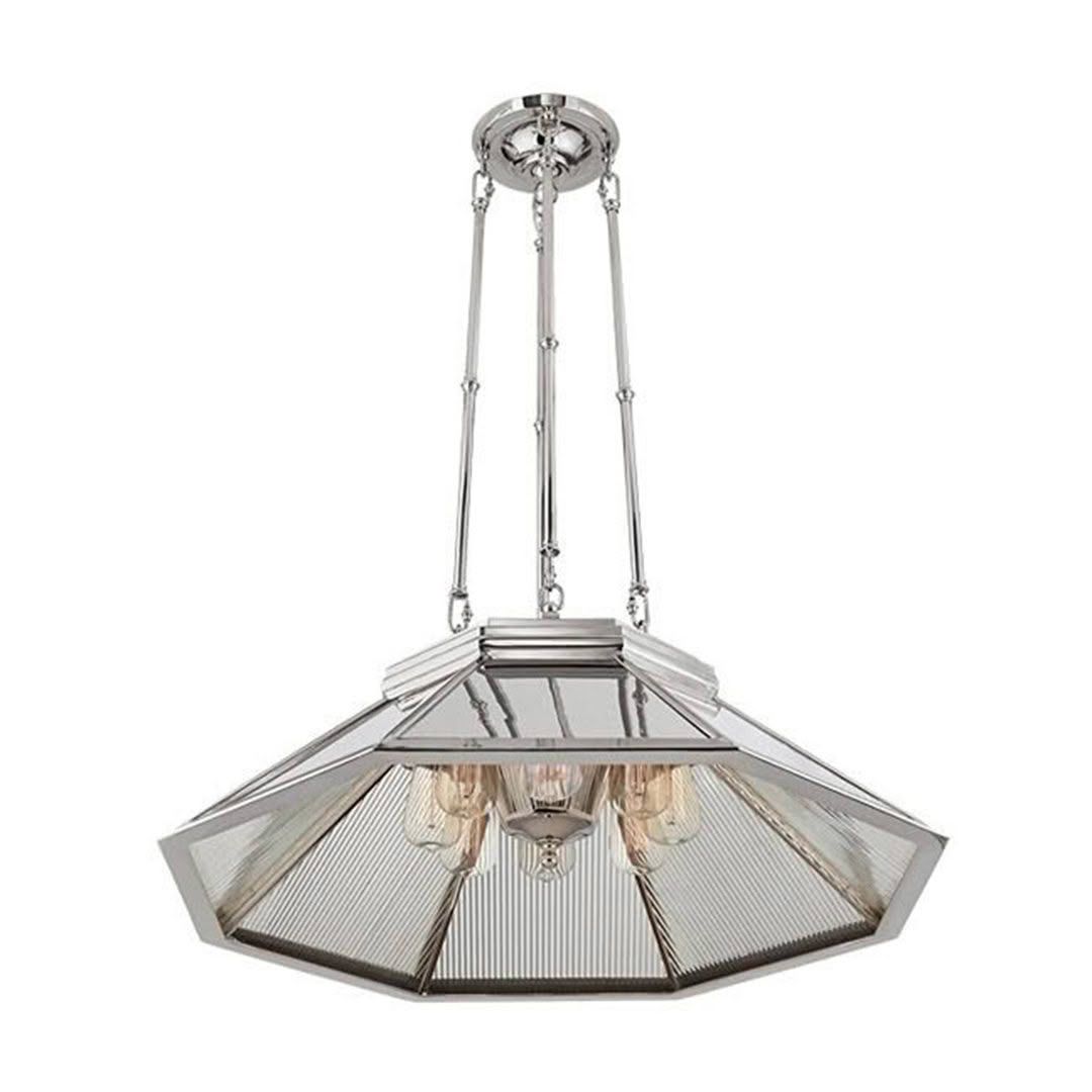 Modeled after turn-of-the-century industrial lighting fixtures, Ralph Lauren’s Rivington chandelier is presented in a range of finishes and paired with your choice of clear, white, or ribbed mirror glass. Eight individual panels come together to create the shade’s precise angles while ensuring light is brilliantly reflected throughout the room.