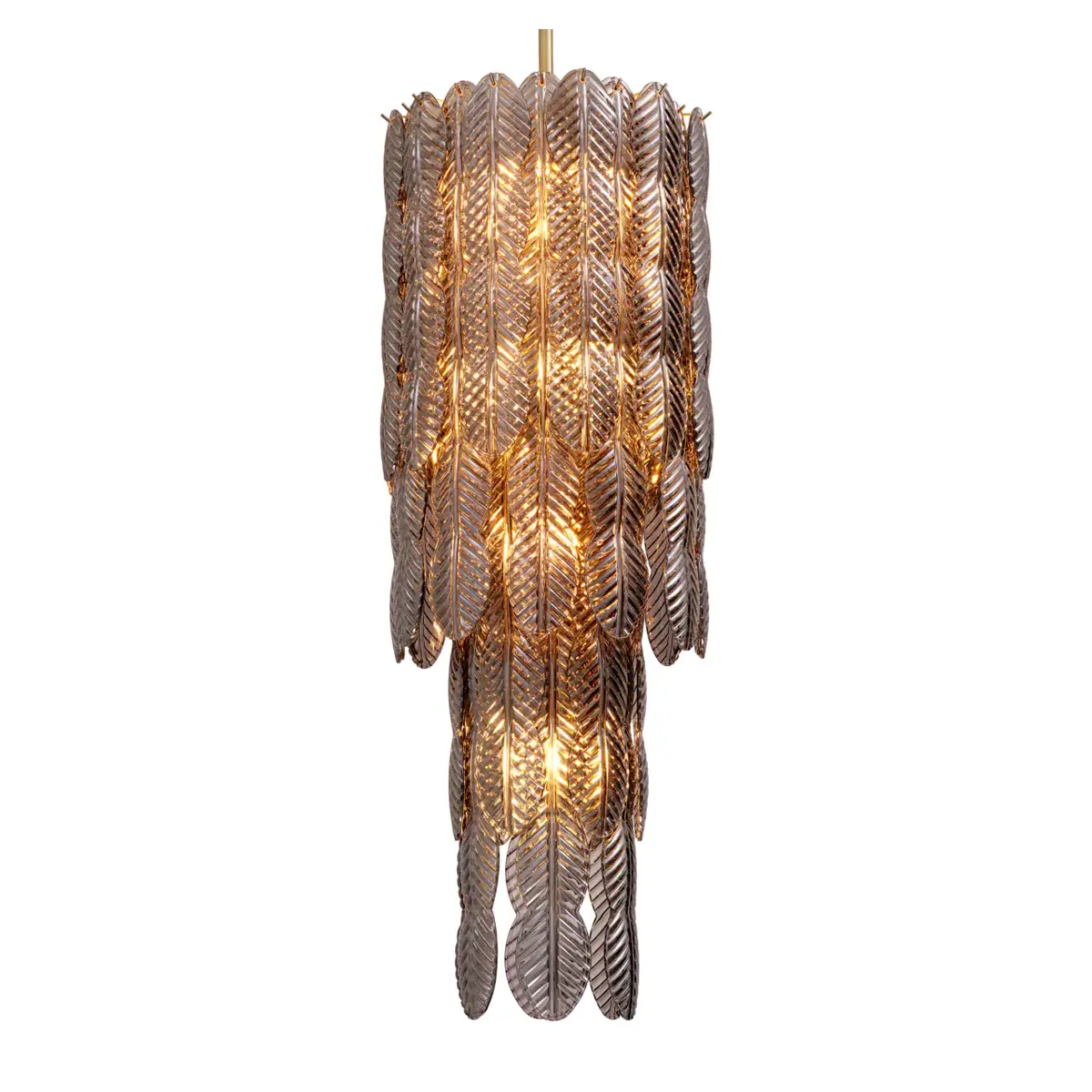 Emulating the lines that articulate the granite column’s palm-like form, the chandelier’s smoked-glass elements exude an air of timeless elegance. In size L, standing at 123 cm. in height and boasting a 46-cm. diameter, it captivates with a brushed-brass finish. This exquisite piece embodies the spirit of ancient craftsmanship and modern luxury, adding a touch of opulence to any space.