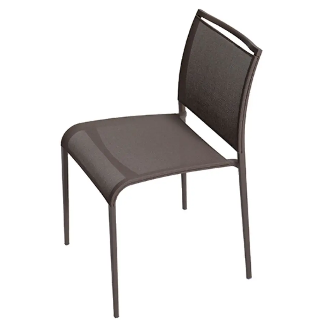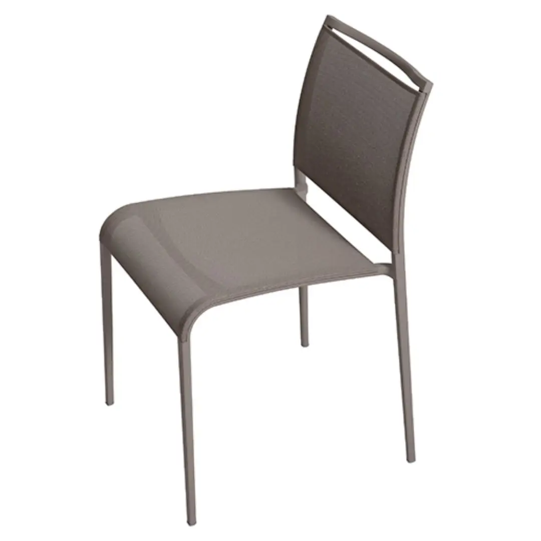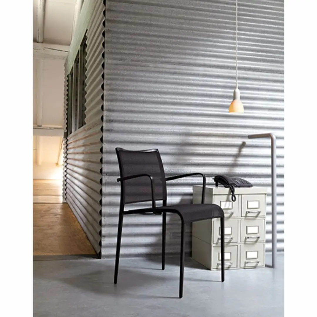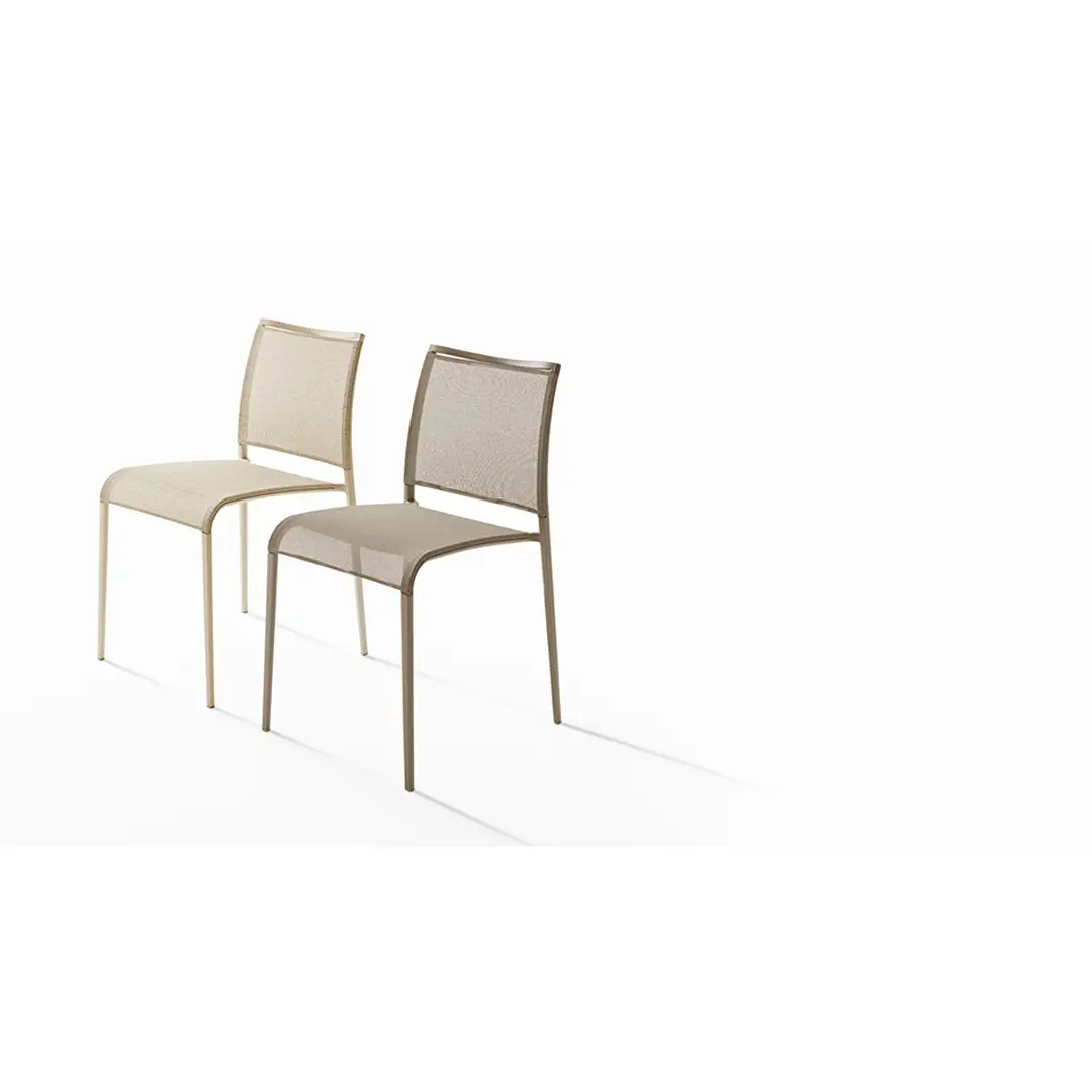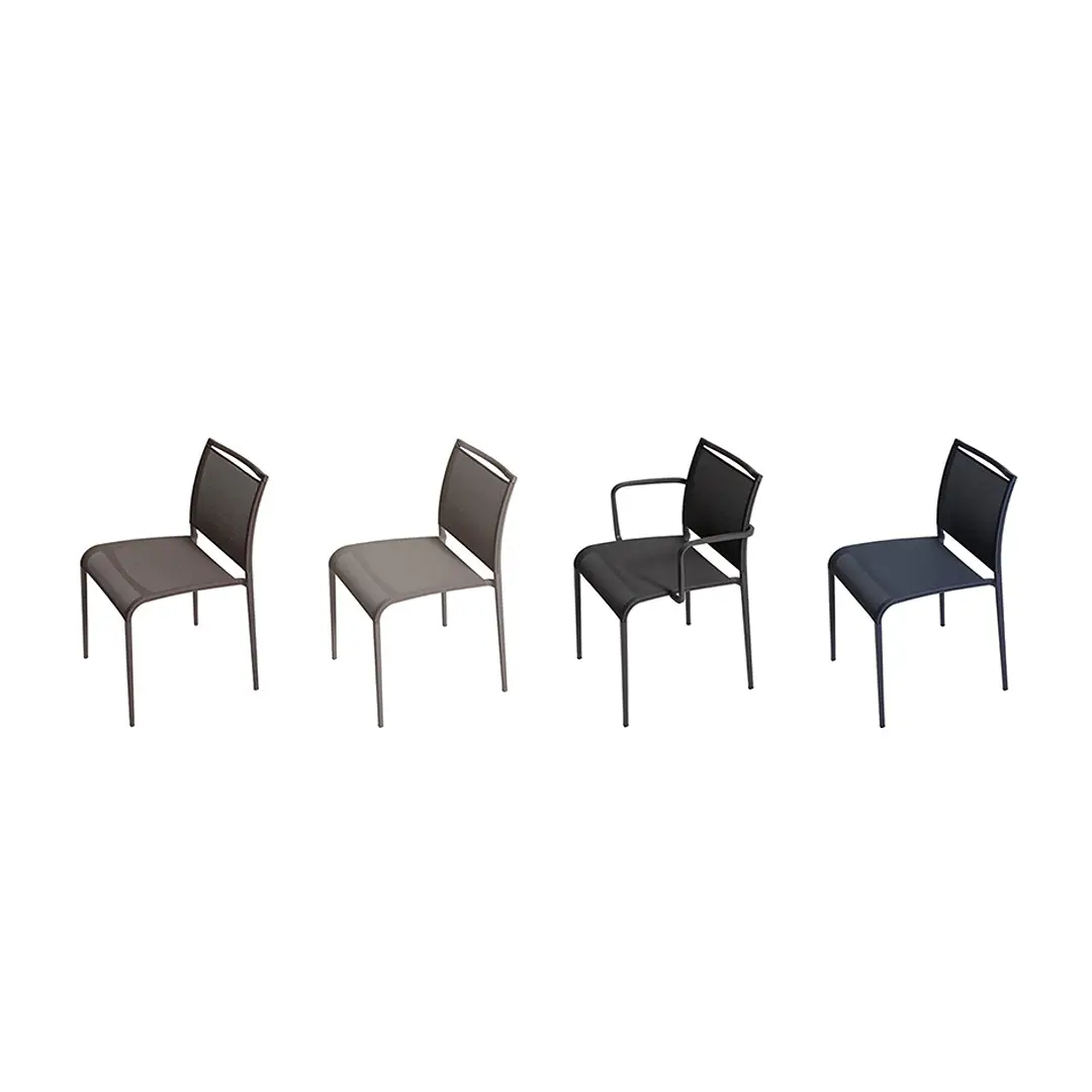 Light to the sight and in the weight thanks to a structure in die-cast aluminium and to a polyester net seat and back. Solid and strong Sand Light is a suited contact between structural stability and formal sobriety. Stackable chair with or without arms, die-cast aluminium frame. Seat and back in mesh made of polyester thread covered with PVC and hemp (Sand Air Canatex) in the colours black, cocoa brown, turtle-dove, sand, straw-colour, medium brown, brown, red or polyester mesh covered with PVC (Sand Air Duo) in the colours grey piombo, grey ghisa, blue. Frame in chrome, lithium, matt ossidiana, polished ossidiana or lacquered in the colours black, cocoa brown, turtle-dove, straw-colour, testa di moro, medium brown, brown, anthracite, graphite, red, blue. Also for outdoor use (except frame in chrome, matt ossidiana and polished ossidiana).