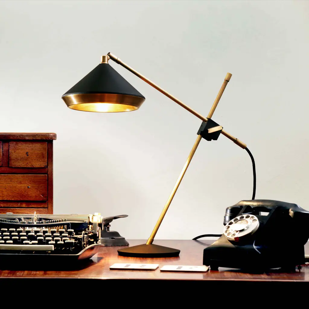 Crafted from brass and turned steel, the Shear Table Lamp draws inspiration from the 1930’s for a timeless look. A brushed finish on the inner shade produces a soft, warm light making it the perfect task lamp.