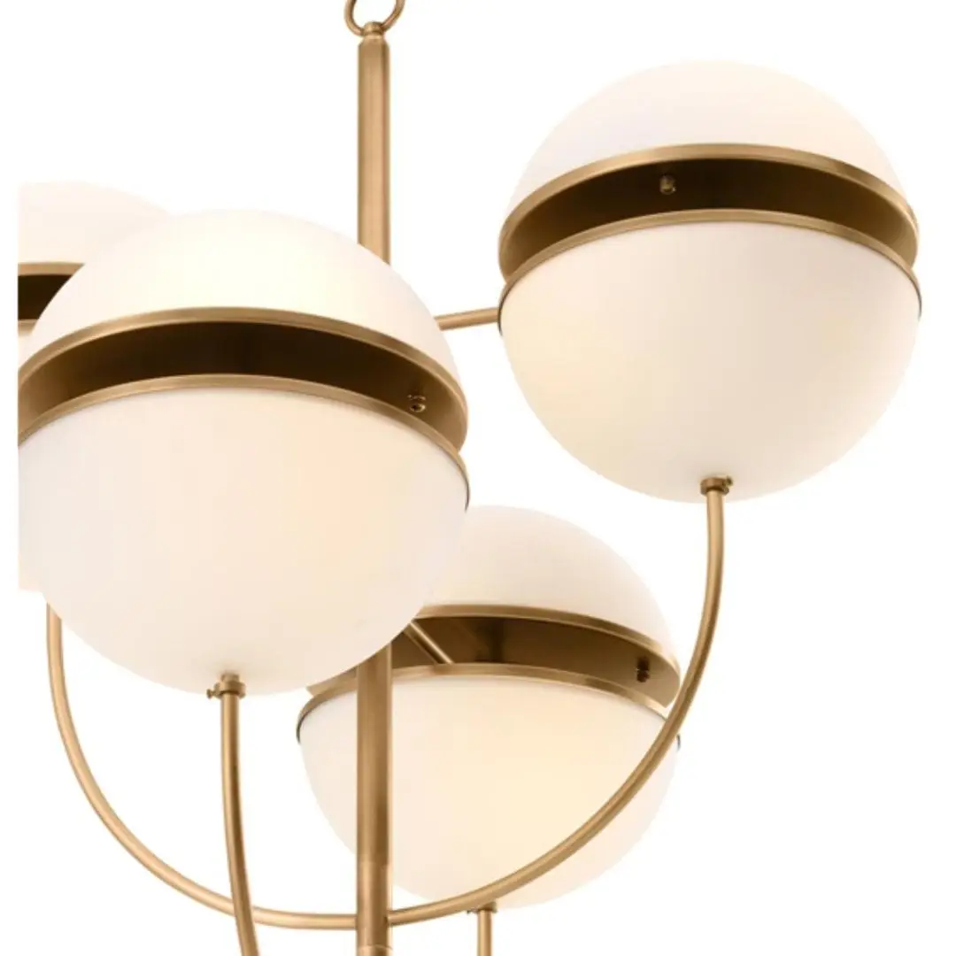 Inspired by futuristic designer lighting from the 1960s, the Spiridon Chandelier exudes Mid-Century Modern appeal. The fixture has a sophisticated antique brass finish and each lampshade is formed by two half spheres from white glass with an open space in between.