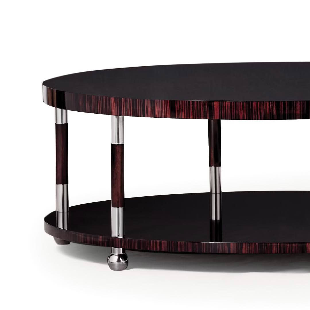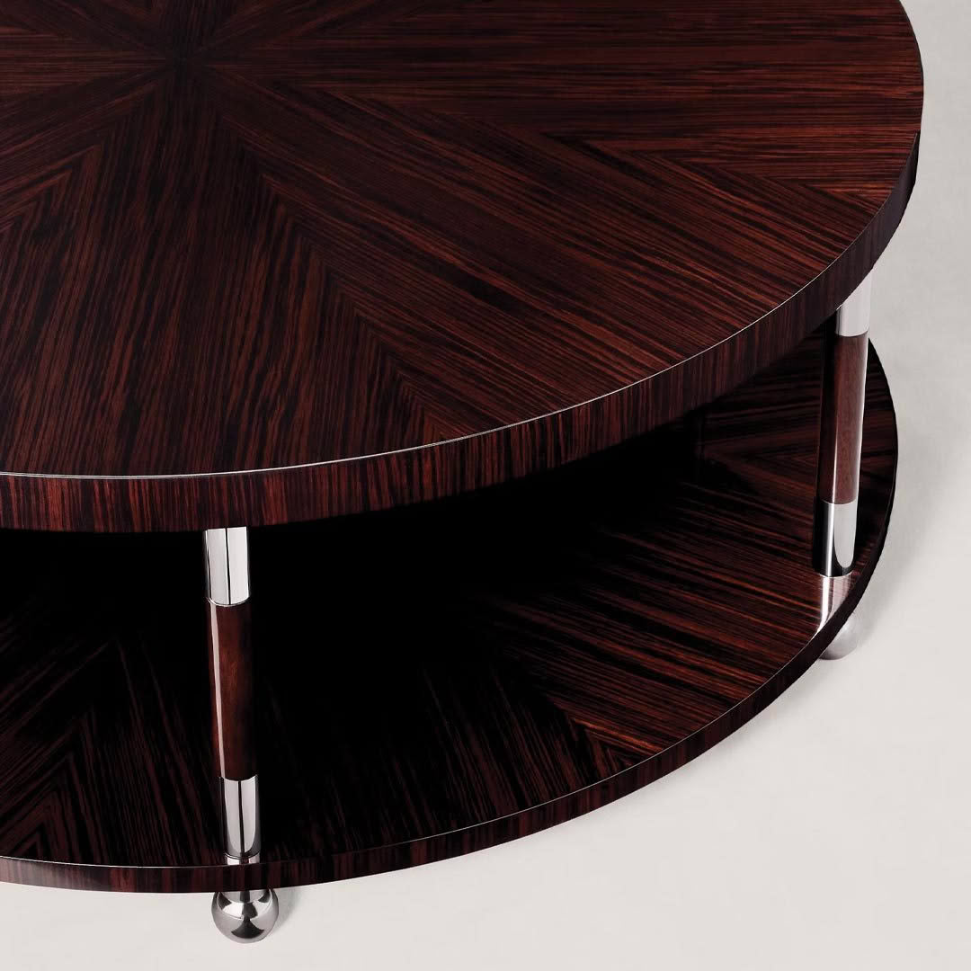Art Deco minimalism inspires the Sterling cocktail table, which features a two-tier silhouette crafted from solid wood with hand-selected macassar ebony veneers. Polished stainless steel trim and spherical feet contrast the striking grain.